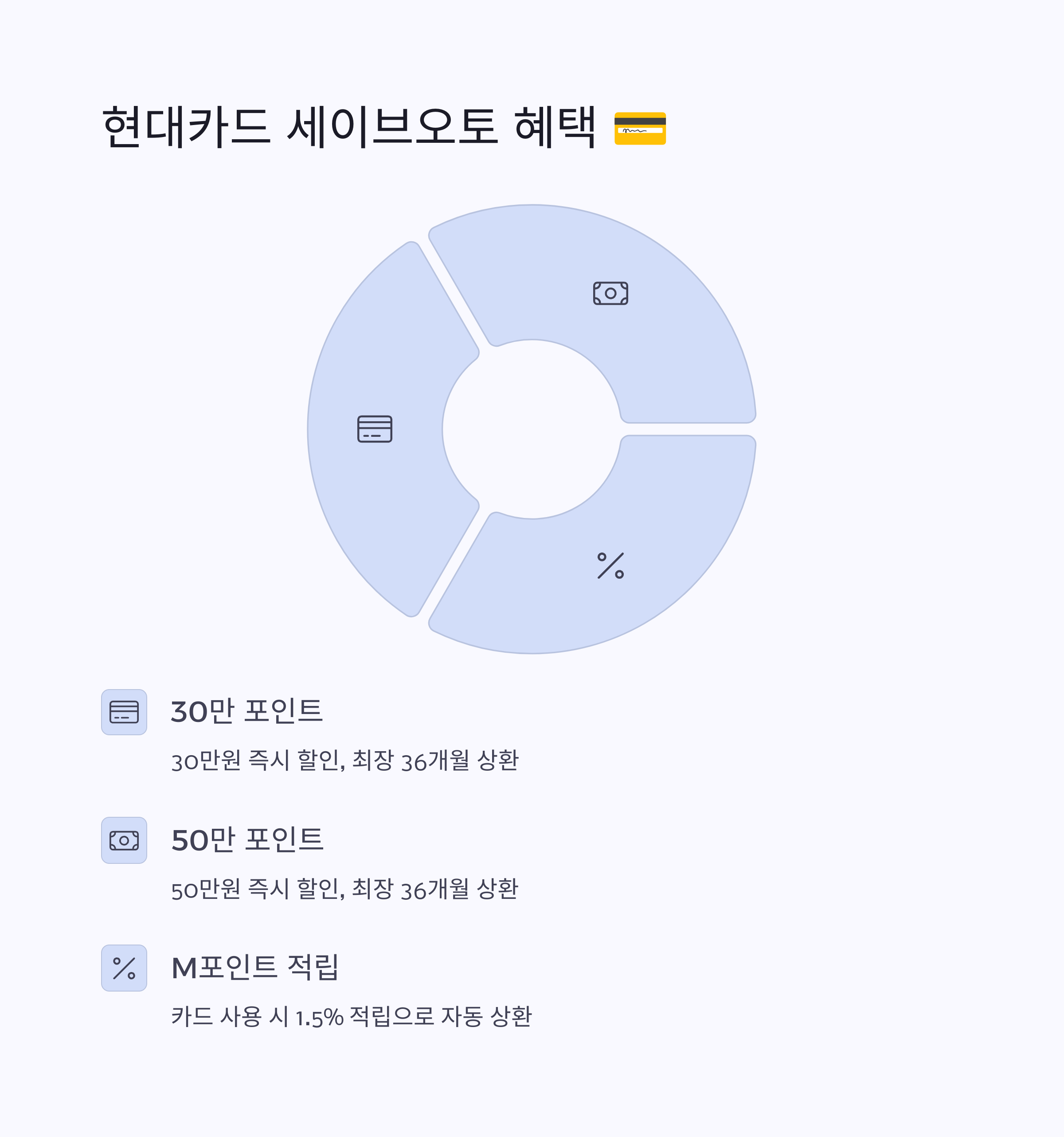 - 현대카드 세이브오토: 30~50만원 포인트 혜택