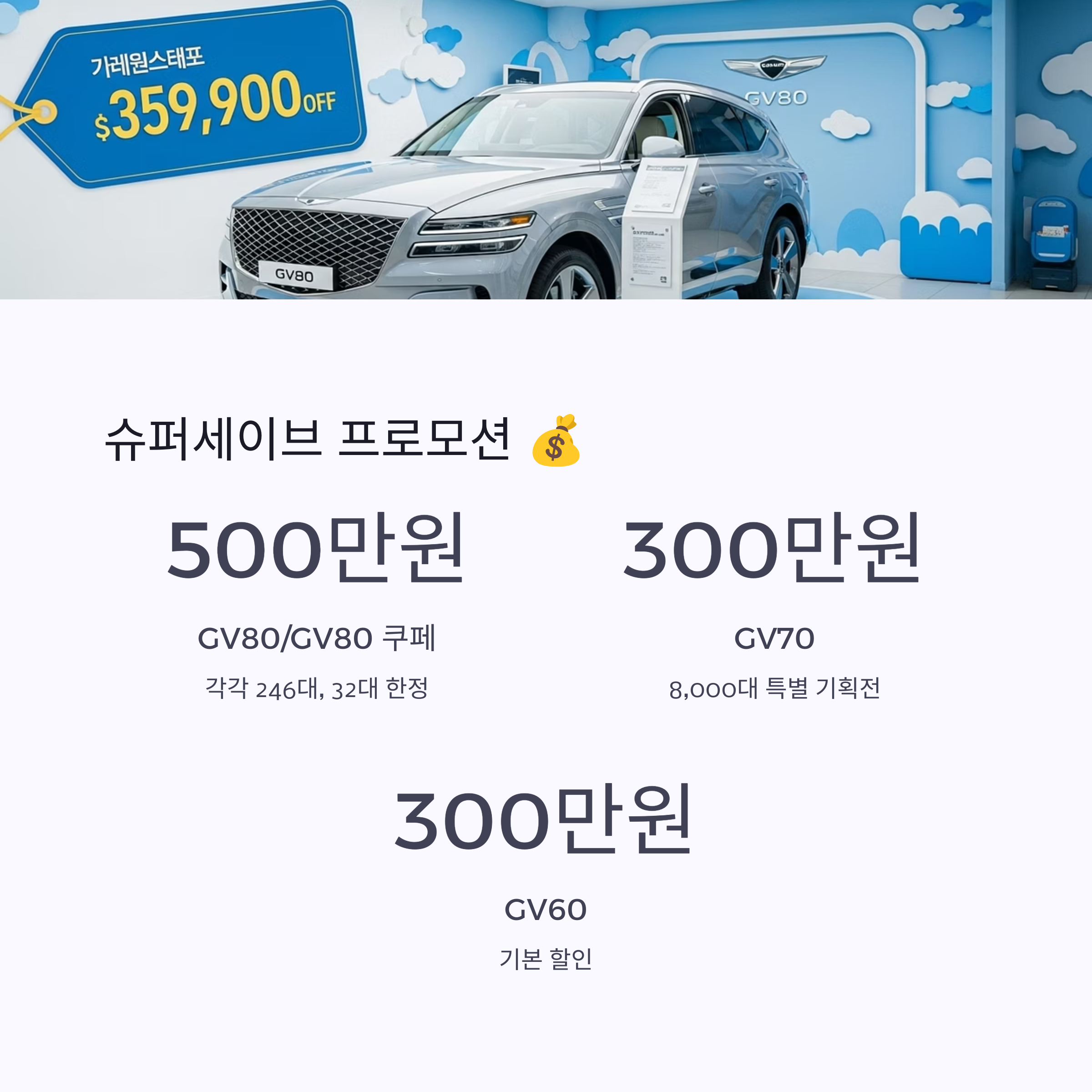 - 슈퍼세이브 특가: GV80 500만원, GV70 300만원 할인 (수량 한정)