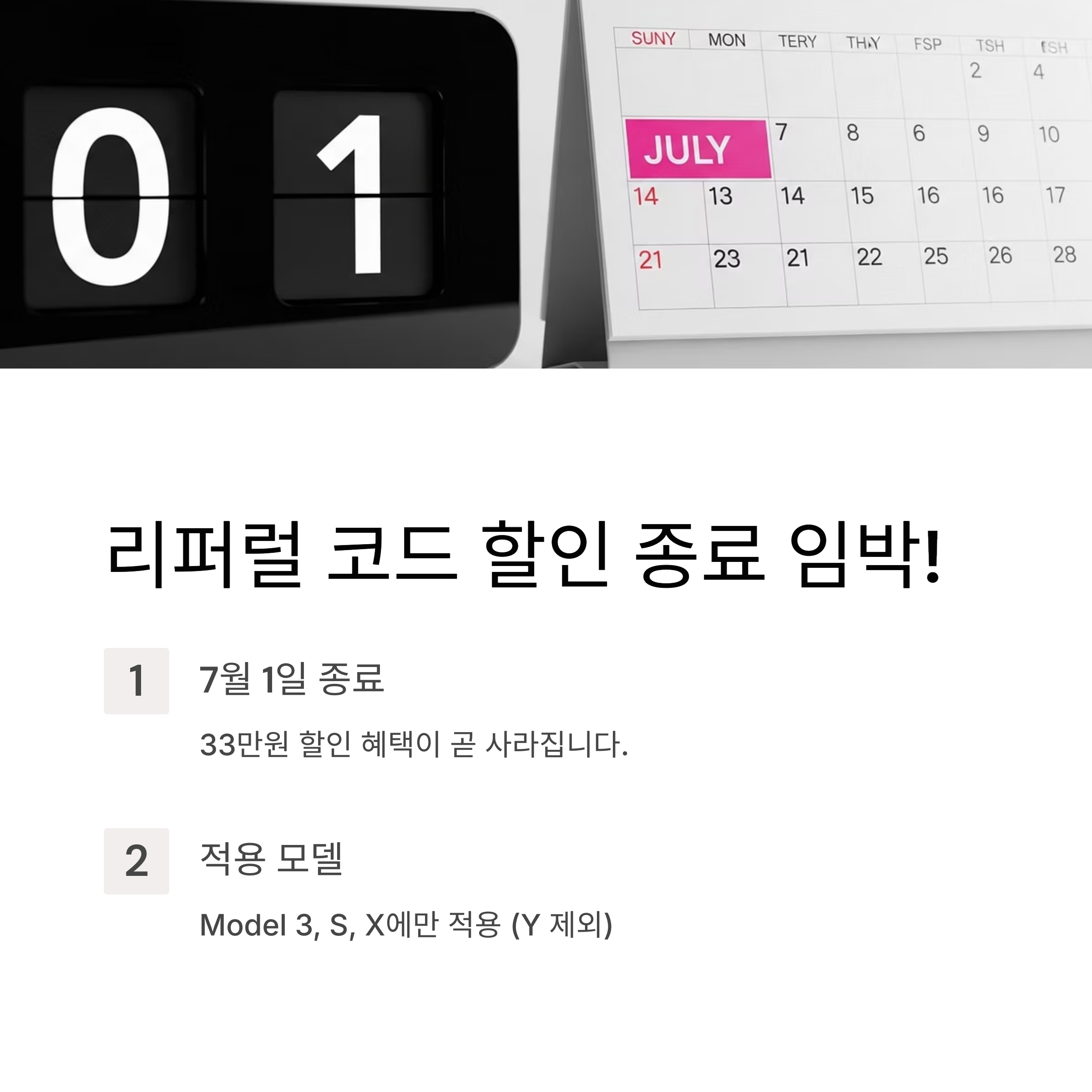 테슬라의 대표적인 구매 혜택인 리퍼럴 코드를 통한 할인이 2025년 7월 1일 종료 예정입니다. 현재까지 모델 3, 모델 S, 모델 X 구매 시 33만원의 할인을 받을 수 있으며, 이는 테슬라가 제공하는 공식적인 추천 프로그램의 일환입니다.
