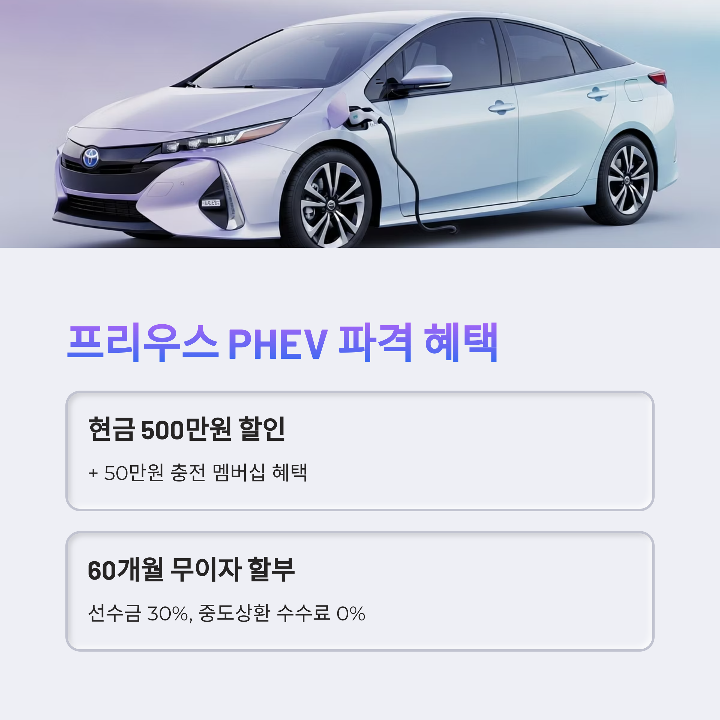 - 최대 혜택: 현금 500만원 + 충전 멤버십 (프리우스 PHEV)