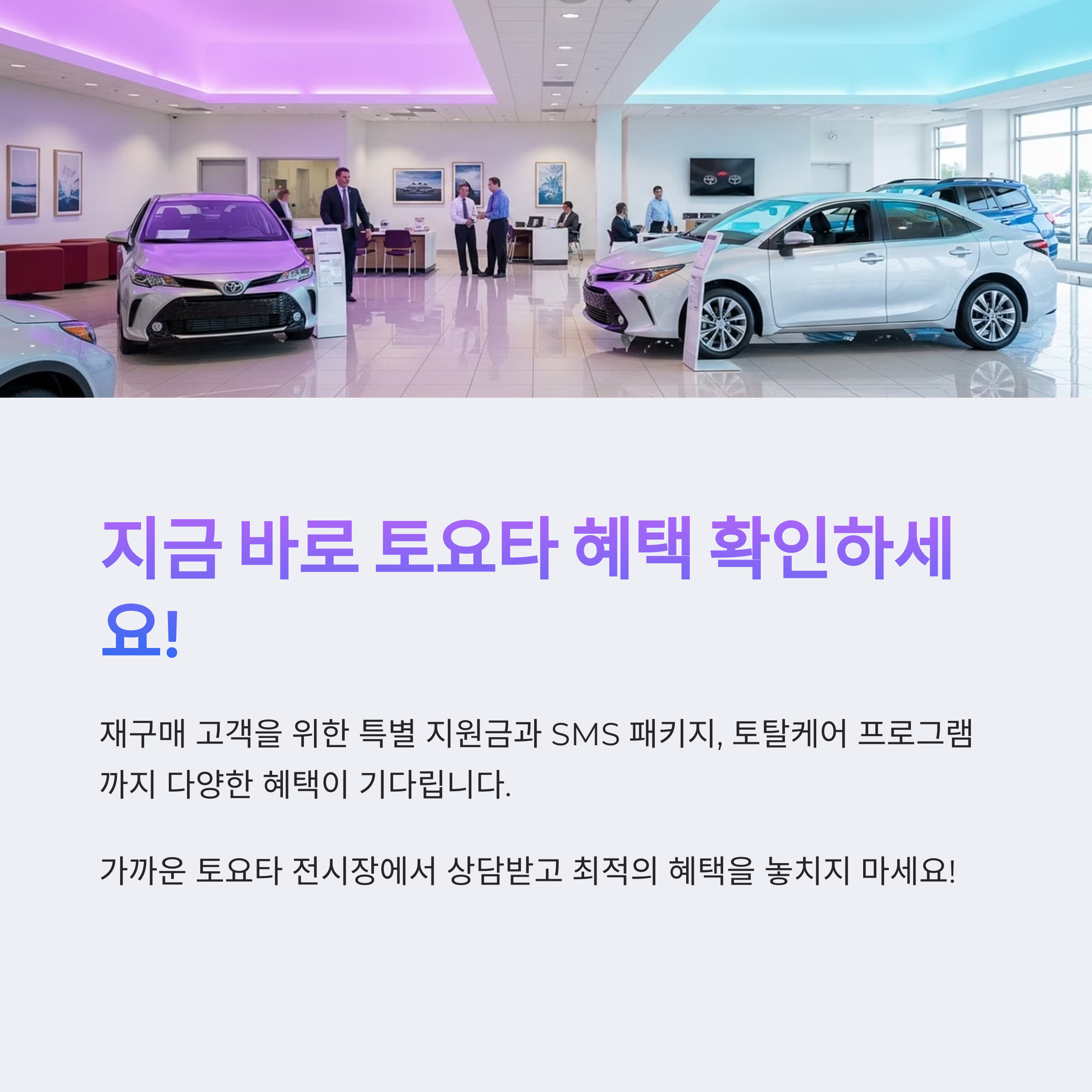 토요타에서는 신규 고객뿐만 아니라 기존 토요타/렉서스 오너들을 위한 특별한 혜택도 준비되어 있습니다. 재구매 혜택과 함께 스마트 메인터넌스 서비스(SMS) 패키지 등 차량 구매 후에도 지속적인 혜택을 받을 수 있습니다.