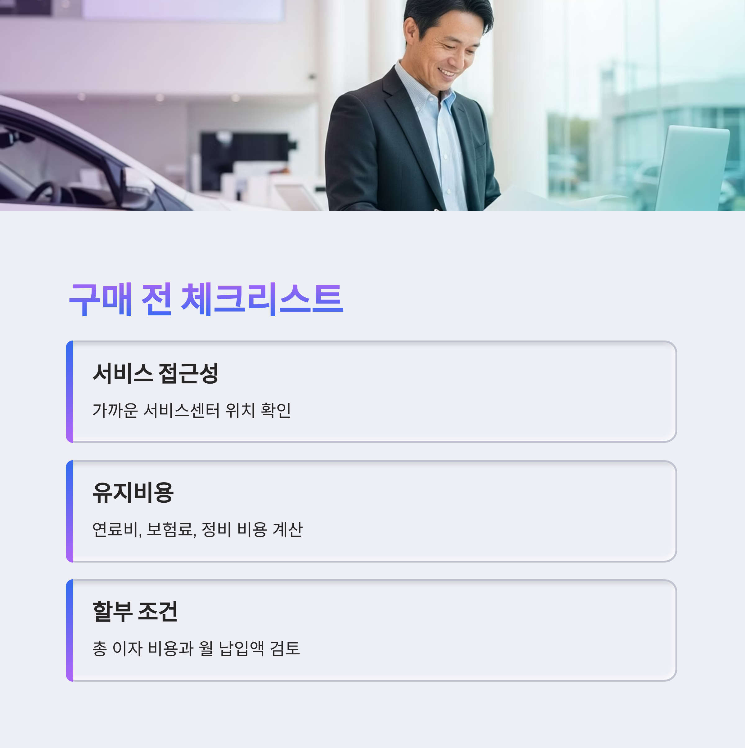 또한 할부 조건을 꼼꼼히 검토하는 것도 필요합니다. 단순히 월 납입액만 보지 말고, 총 이자 비용과 선납금 비율, 할부 기간 등을 종합적으로 고려하여 자신에게 가장 유리한 조건을 찾아야 합니다.