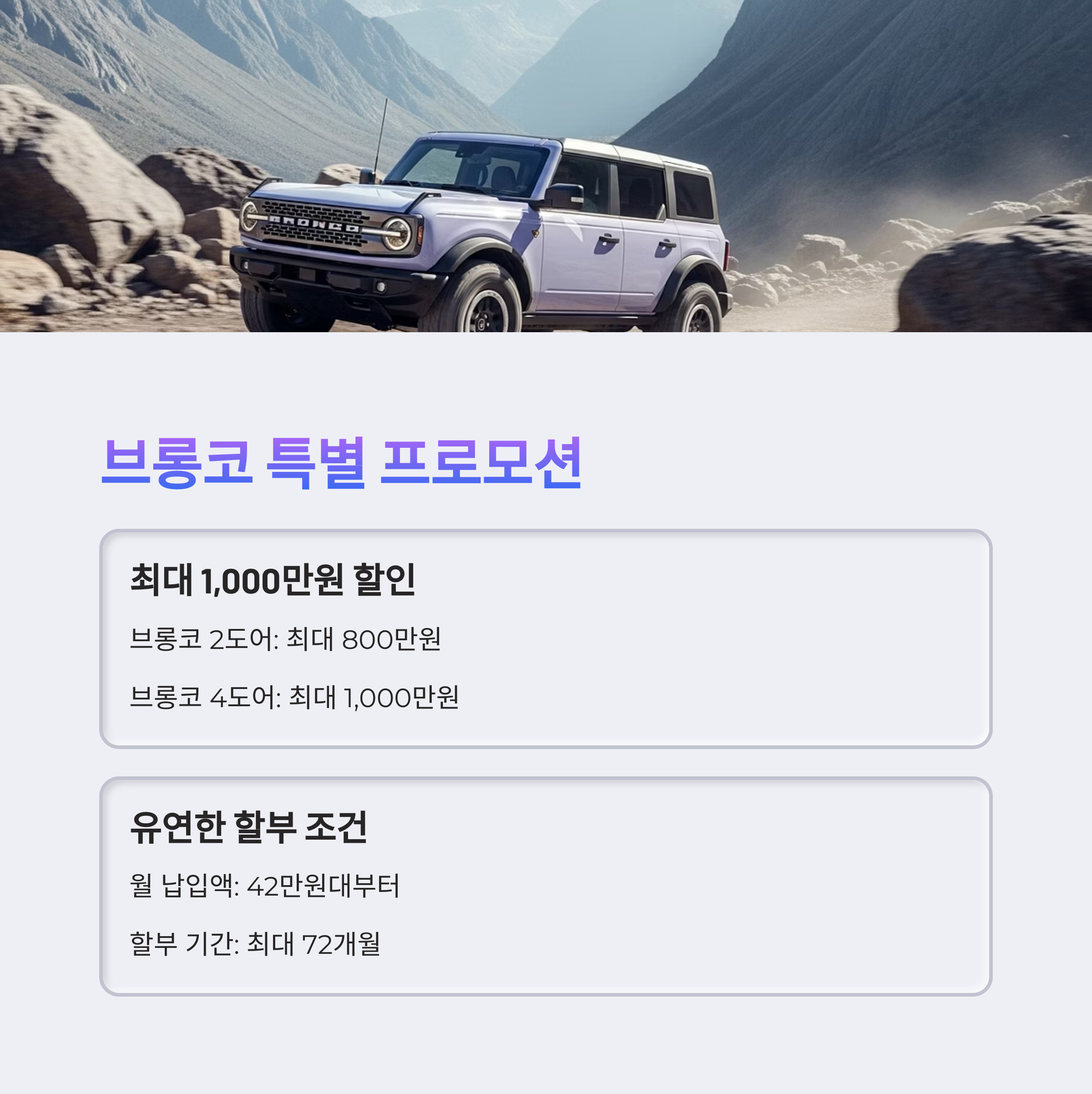 브롱코의 경우 특히 월 납입액 부담을 줄이기 위한 다양한 할부 옵션이 제공됩니다. 선납 비율을 48-54% 수준으로 설정하면 월 42만원대부터 구매가 가능하며, 이는 프리미엄 SUV 시장에서 상당히 경쟁력 있는 조건입니다.
