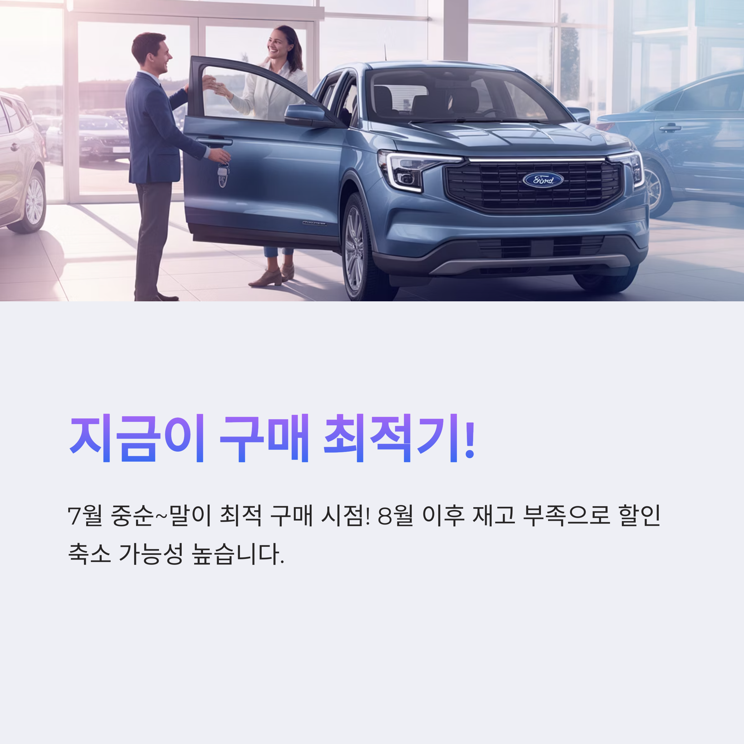 따라서 포드 차량 구매를 고려하고 있다면 7월 중에 결정하는 것이 가장 유리할 것으로 판단됩니다. 특히 분기말인 7월 말이나 8월 초에는 딜러들이 실적 달성을 위해 추가적인 혜택을 제공할 가능성이 높으므로, 이 시점을 노려보는 것을 추천합니다.