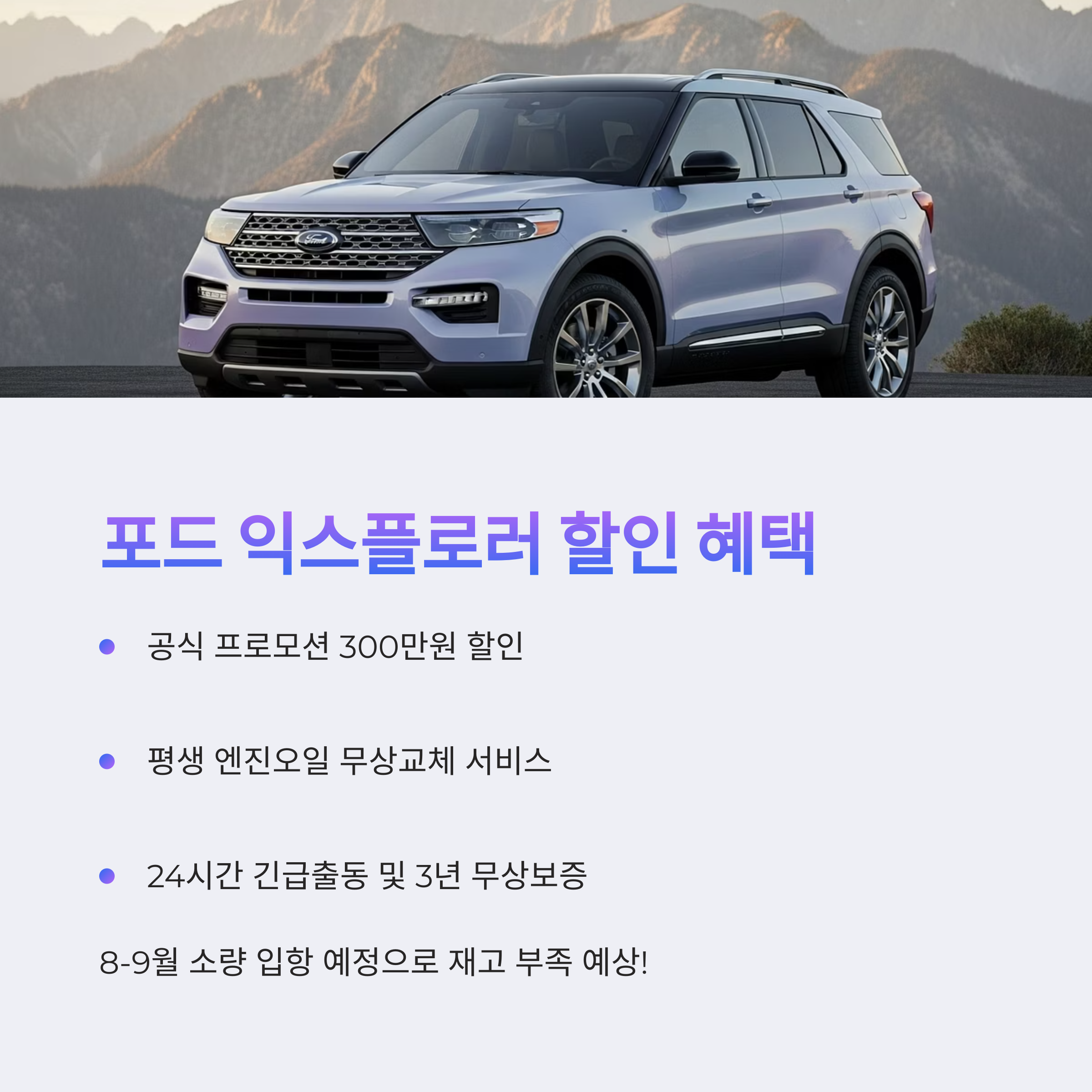 하지만 이러한 프로모션은 재고 상황과 시장 상황에 따라 언제든지 변경될 수 있습니다. 특히 익스플로러의 경우 소량 입항 예정이므로 8-9월에는 재고 부족으로 인해 할인 조건이 축소될 가능성이 높습니다.