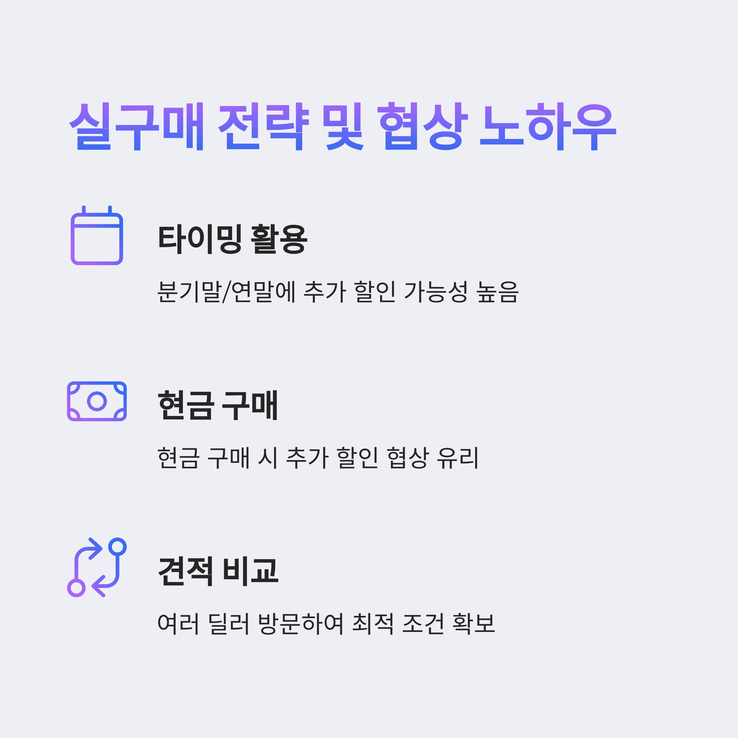 협상 시에는 현금 구매 여부, 기존 차량 트레이드인 가능성, 할부 조건 등을 종합적으로 고려해야 합니다. 특히 분기말이나 연말에는 딜러들이 실적 목표 달성을 위해 추가 할인을 제공하는 경우가 많으므로, 이러한 시기를 노려보는 것도 좋은 전략입니다.