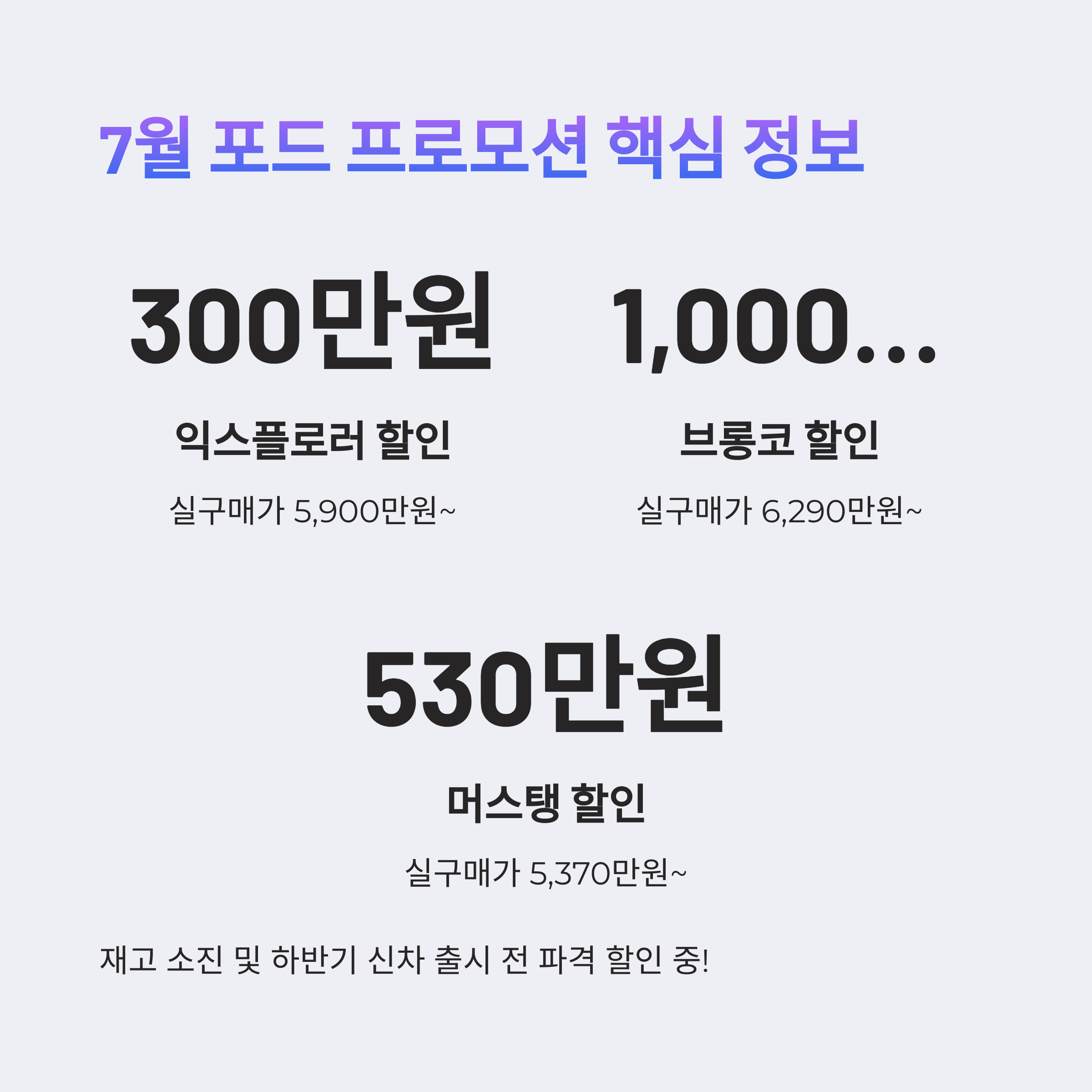 현재 프로모션은 재고 상황에 따라 조기 종료될 수 있습니다. 특히 익스플로러의 경우 소량 입항으로 인해 8월 이후 할인 혜택이 축소될 가능성이 높으니, 관심 있는 분들은 서둘러 상담받으시기 바랍니다.