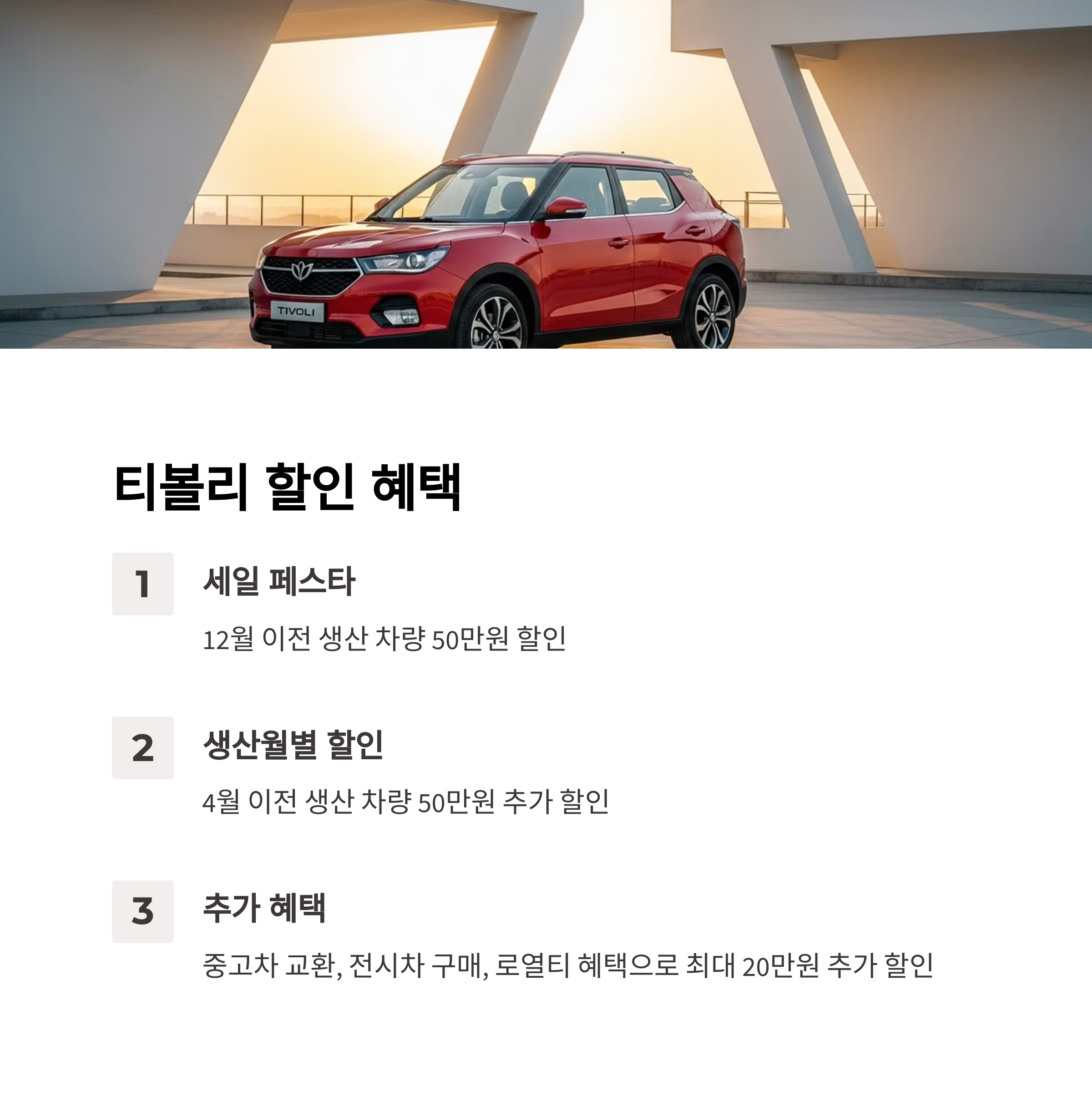 티볼리 구매 시 가장 유리한 조건은 12월 이전 생산 차량을 선택하는 것입니다. 세일 페스타와 생산월별 할인을 모두 받으면 최대 100만원까지 할인받을 수 있으며, 여기에 중고차 교환이나 로열티 혜택까지 더하면 추가 절약이 가능합니다.