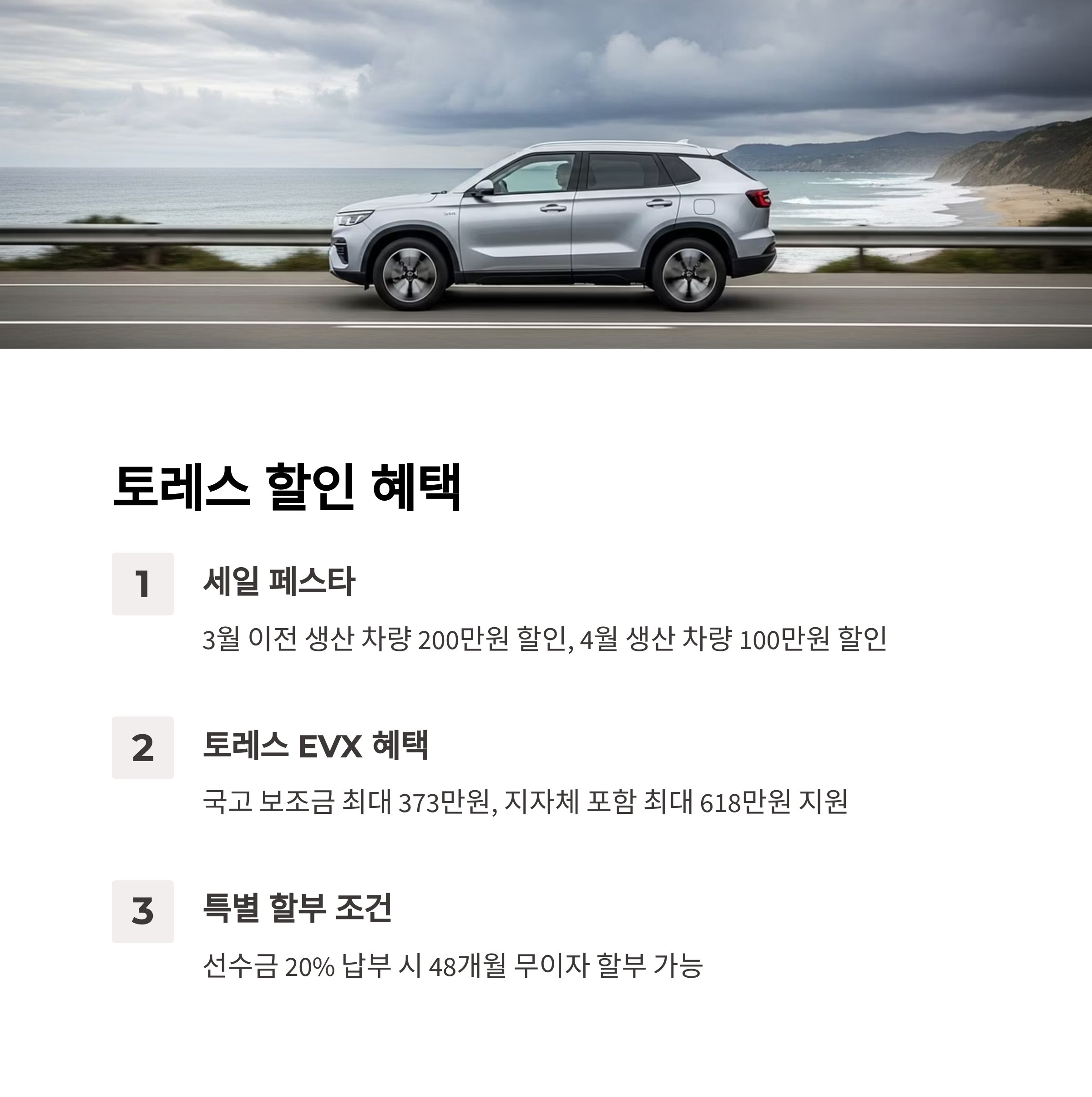 KG모빌리티의 플래그십 모델인 더 뉴 토레스는 다음과 같은 할인 혜택을 제공합니다: