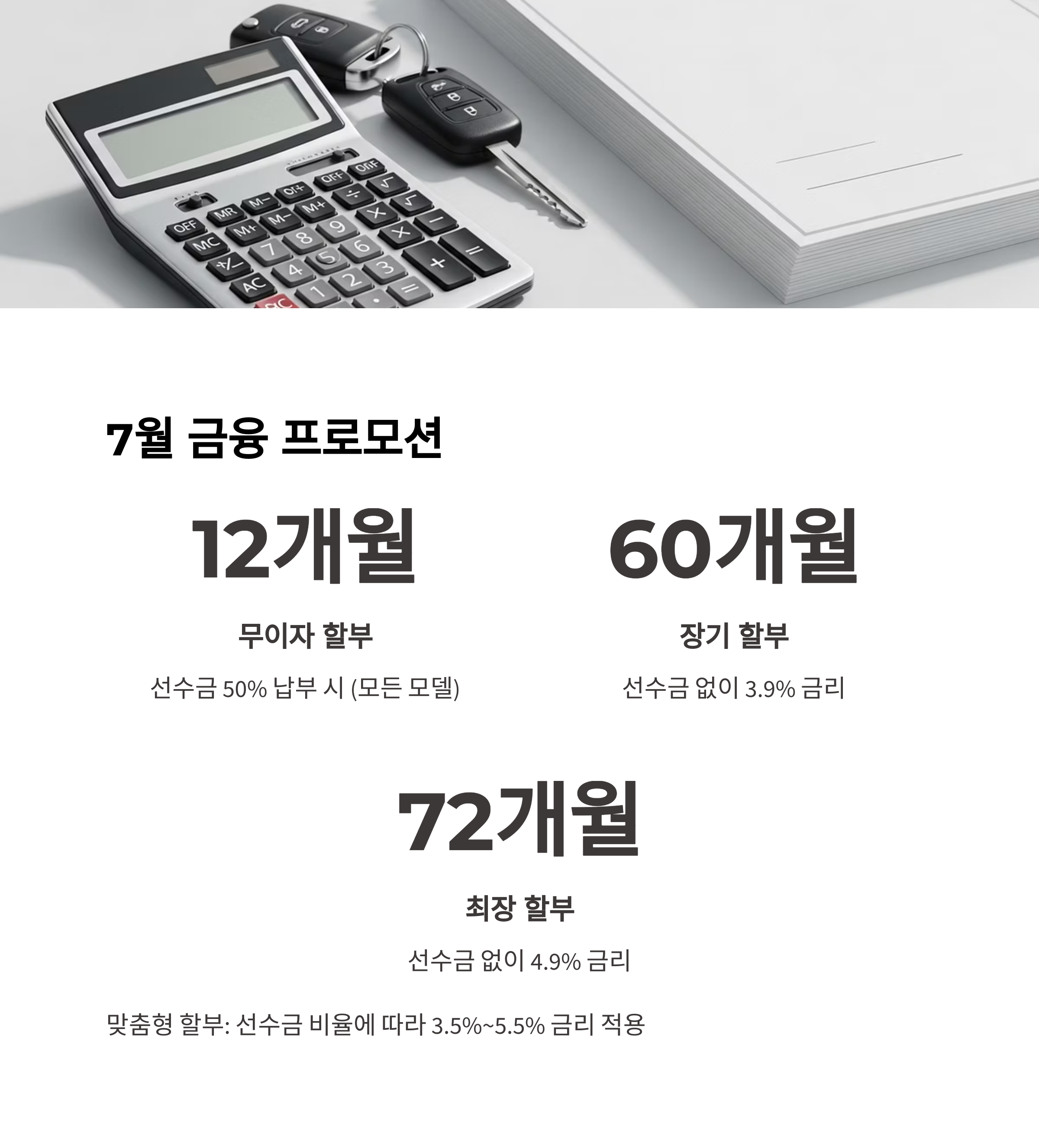 이번 7월 프로모션의 핵심은 선수금 50% 조건 12개월 무이자 할부와 선수금 없는 72개월 장기 할부 옵션입니다. 또한 중고차 교환, 로열티 고객, 전시차 구매 등 다양한 추가 혜택까지 제공하여 실질적인 구매 부담을 최소화하고 있습니다.