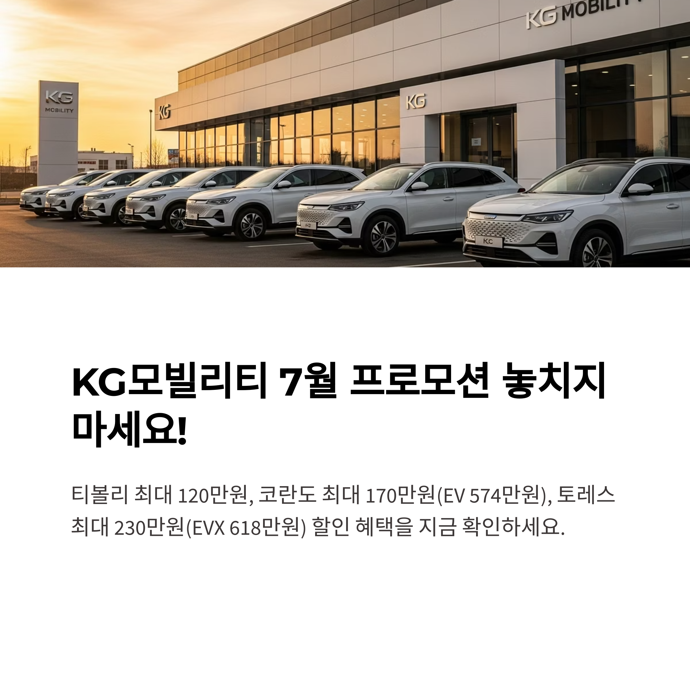 2025년 7월 KG모빌리티(구 쌍용자동차)가 여름 성수기를 맞아 티볼리, 코란도, 토레스 주요 모델에 대한 파격적인 할인 혜택과 무이자 할부 조건을 발표했습니다. 특히 올해는 휴가철 특별 프로모션과 함께 생산월별 차등 할인, 다양한 무이자 할부 옵션을 제공하여 고객 부담을 크게 덜어주고 있습니다.