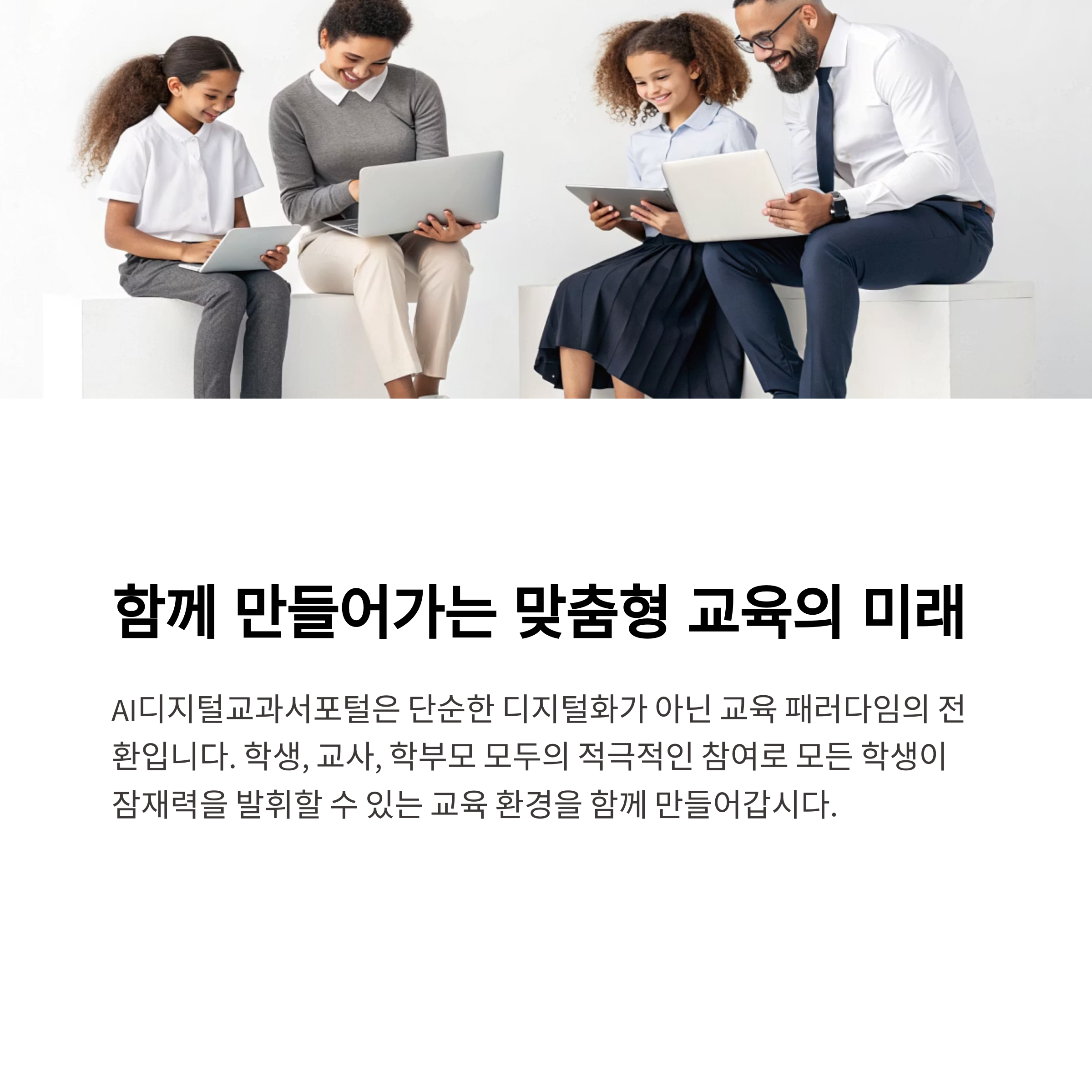 AI디지털교과서포털을 효과적으로 활용하기 위해서는 학생, 교사, 학부모 모두의 적극적인 참여와 협력이 필요합니다. 이 가이드가 AI디지털교과서포털을 이해하고 활용하는 데 도움이 되길 바라며, 모두가 함께하는 맞춤형 교육의 새로운 시대를 준비하는 출발점이 되기를 희망합니다.