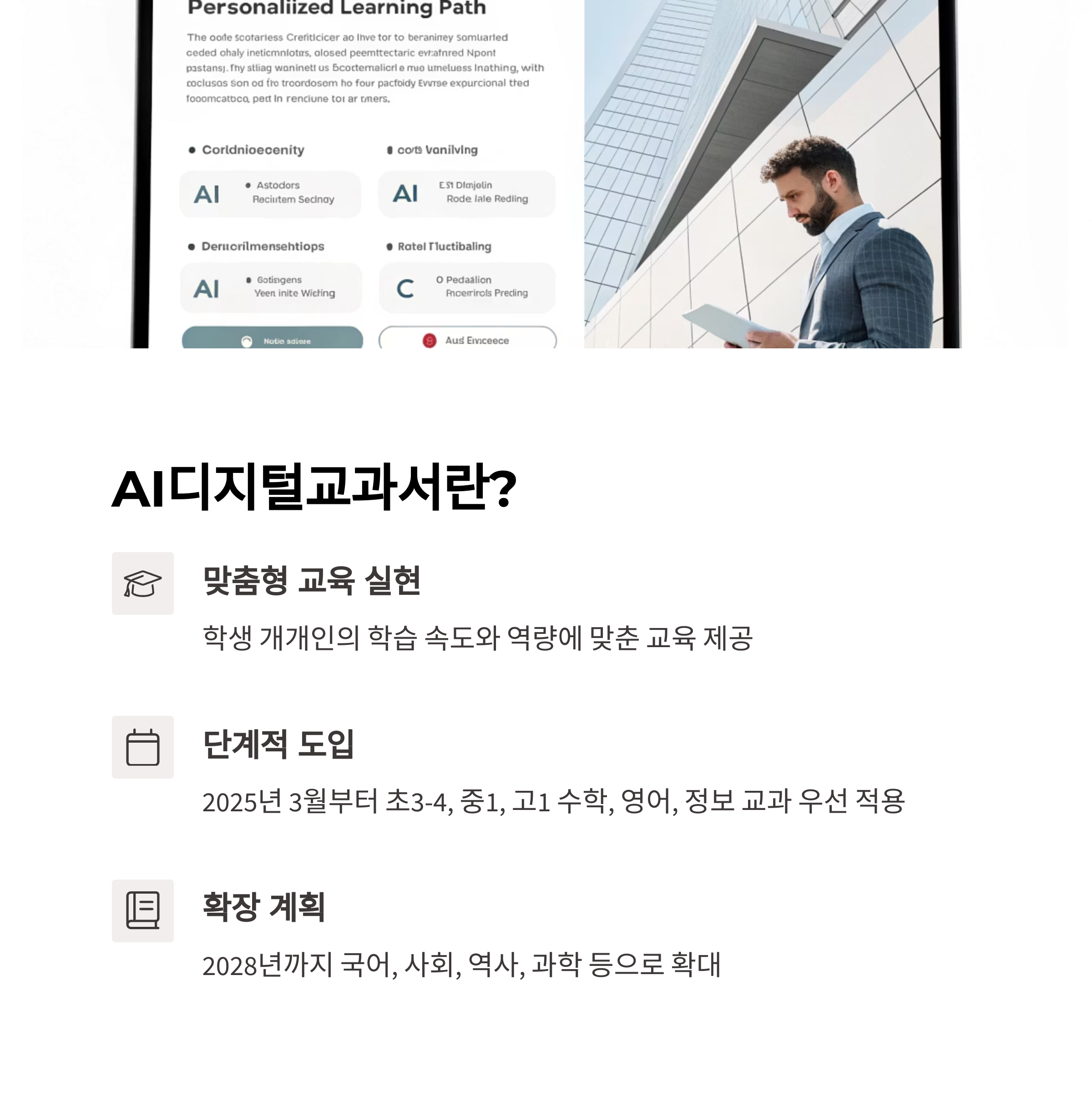 2025년 초기에는 초등학교 3-4학년, 중학교 1학년, 고등학교 1학년의 수학, 영어, 정보 교과를 중심으로 도입되지만, 2028년까지 국어, 사회, 역사, 과학, 기술·가정 등으로 확대될 예정입니다. 궁극적으로는 모든 교과와 학년에 AI디지털교과서가 도입되어 전체 교육과정에서 맞춤형 교육이 실현될 것으로 기대됩니다.