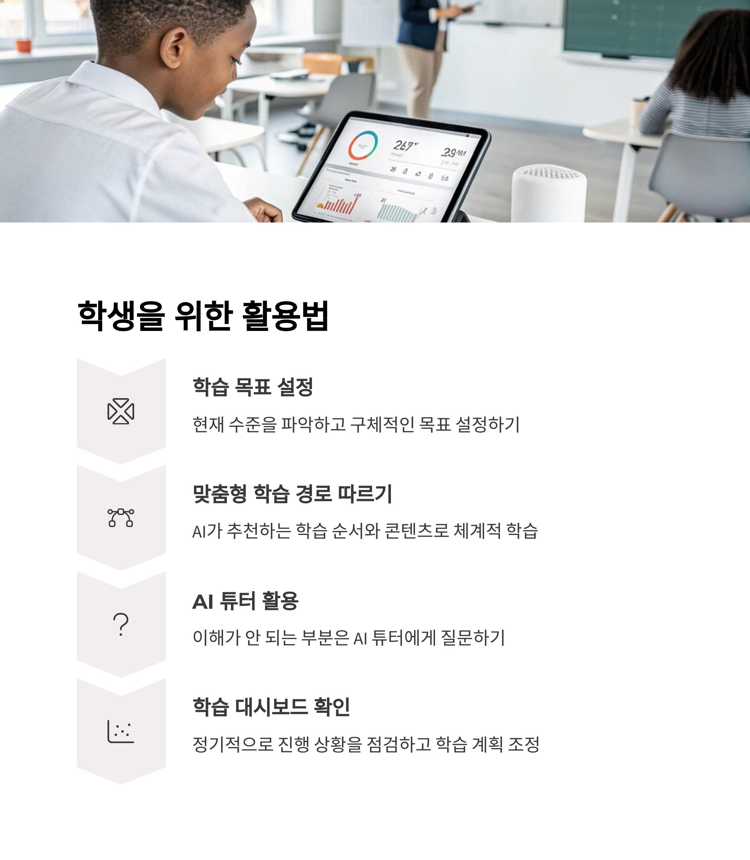 AI 튜터는 학생이 자기주도적으로 학습할 수 있도록 지원하는 중요한 기능입니다. 학생들은 학습 중 이해가 되지 않는 부분에 대해 AI 튜터에게 질문을 하고, 맞춤형 설명과 예시를 받을 수 있습니다. 또한 AI 튜터는 학생의 이해도에 맞춰 적절한 난이도의 문제를 제시하고, 풀이 과정에서의 오류를 즉각적으로 피드백하여 바로잡을 수 있도록 도와줍니다. 이러한 상호작용을 통해 학생들은 마치 개인 교사와 함께하는 듯한 학습 경험을 얻을 수 있습니다.