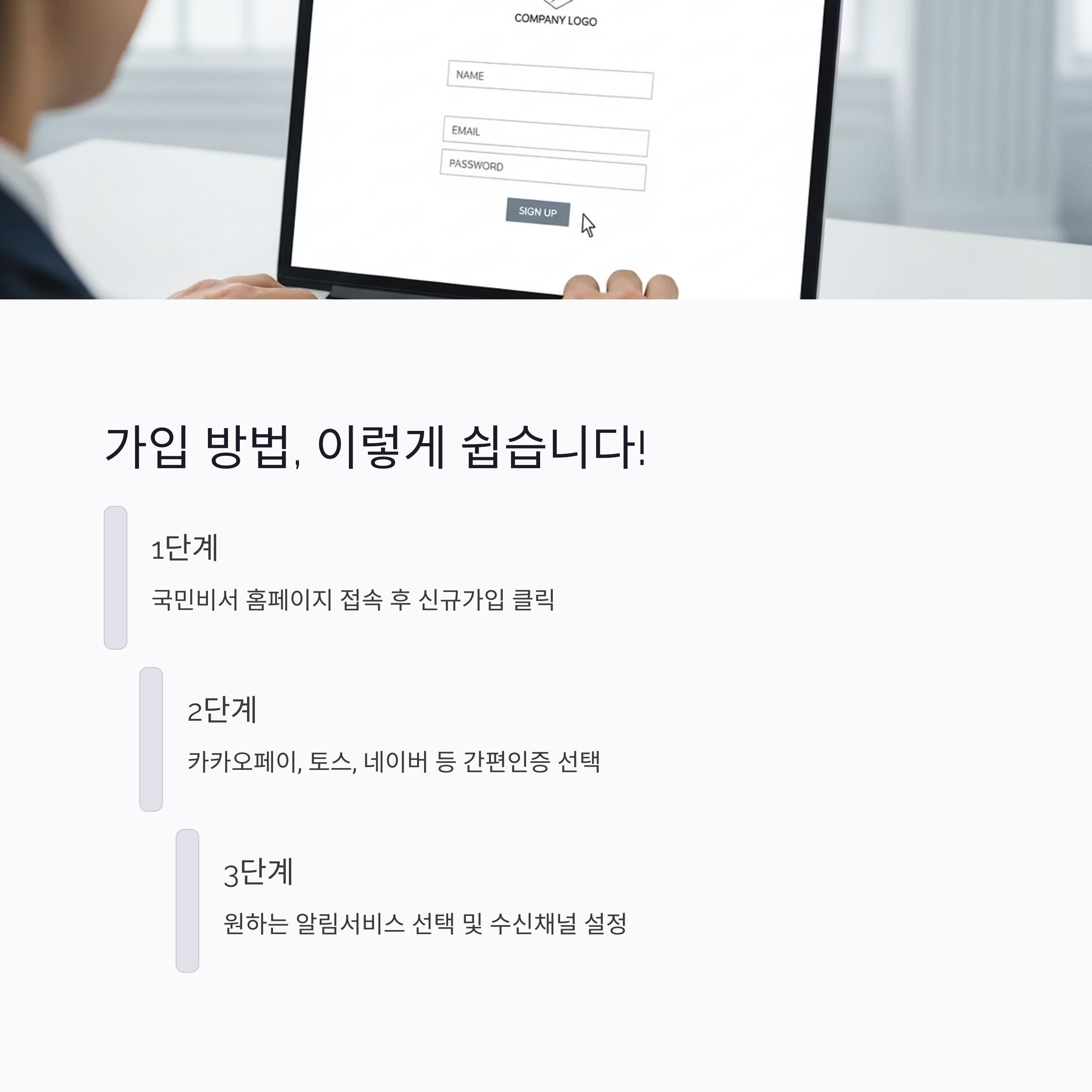 국민비서 알림서비스 가입은 매우 간단합니다. 복잡한 개인정보 입력 없이 간편인증을 통해 가입할 수 있으며, 가입과 동시에 원하는 알림서비스를 선택할 수 있습니다.