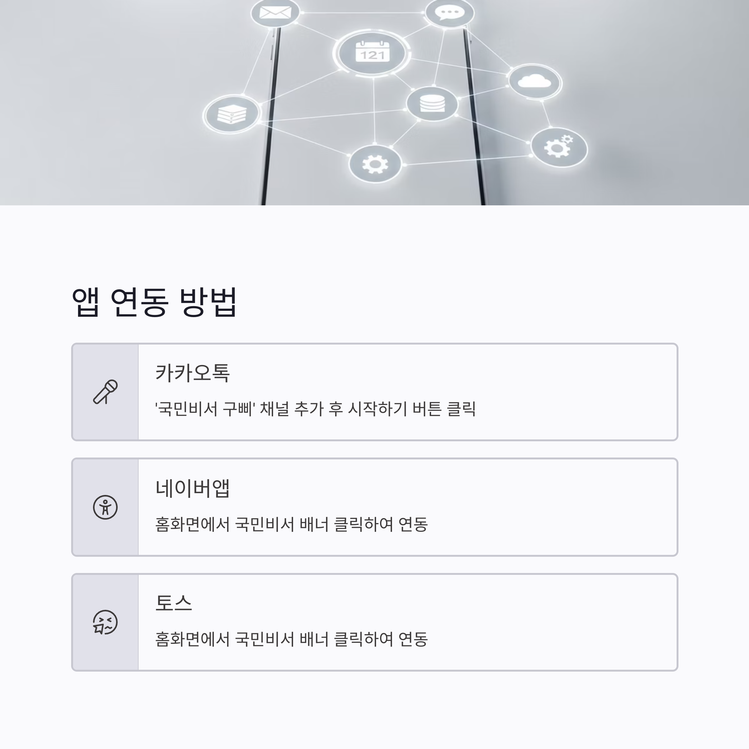 가장 인기 있는 연동 방법은 카카오톡과 네이버앱입니다. 카카오톡의 경우 '국민비서 구삐' 채널을 추가하면 되고, 네이버앱은 홈화면에서 국민비서 배너를 클릭하여 연동할 수 있습니다.