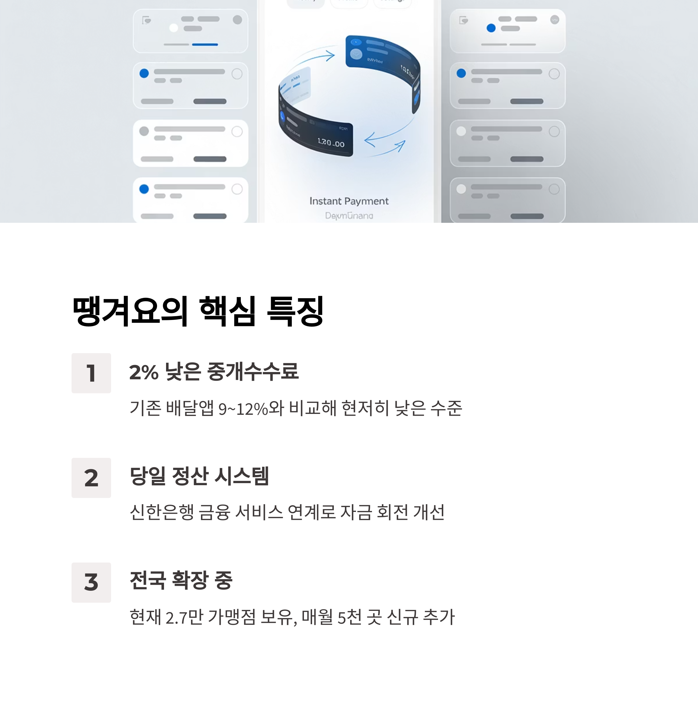 땡겨요의 가장 큰 특징은 2%의 낮은 중개수수료입니다. 이는 기존 배달앱들의 평균 수수료 9~12%와 비교해 현저히 낮은 수준으로, 소상공인들의 부담을 크게 덜어주고 있습니다. 또한 신한은행의 금융 서비스와 연계되어 당일 정산 시스템을 제공하여 자영업자들의 자금 회전에도 도움을 주고 있습니다.