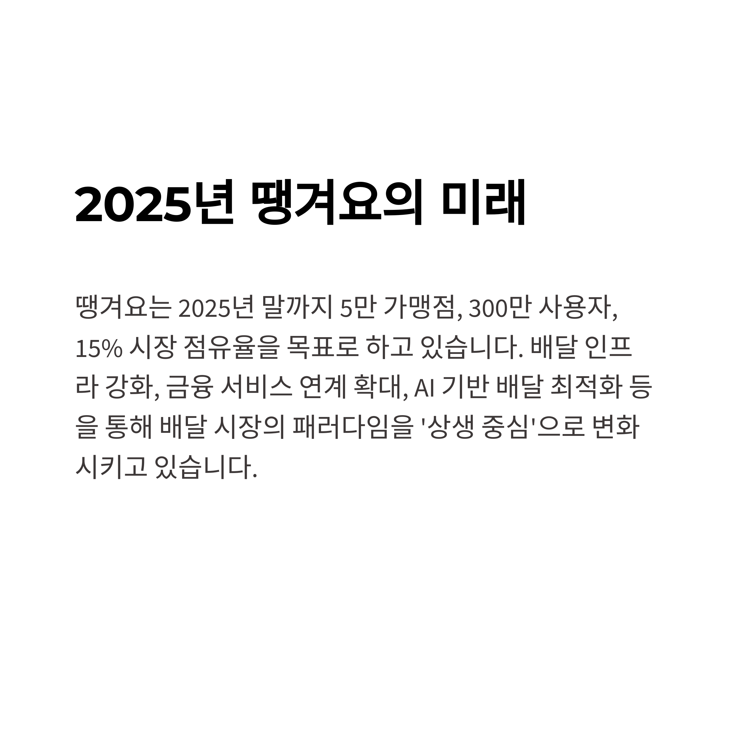 2025년은 땡겨요에게 매우 중요한 한 해가 될 것으로 전망됩니다. 배달대행사와의 협력을 통한 '땡배달' 서비스 본격 출시와 함께 시장 내 입지를 더욱 공고히 할 것으로 예상됩니다.