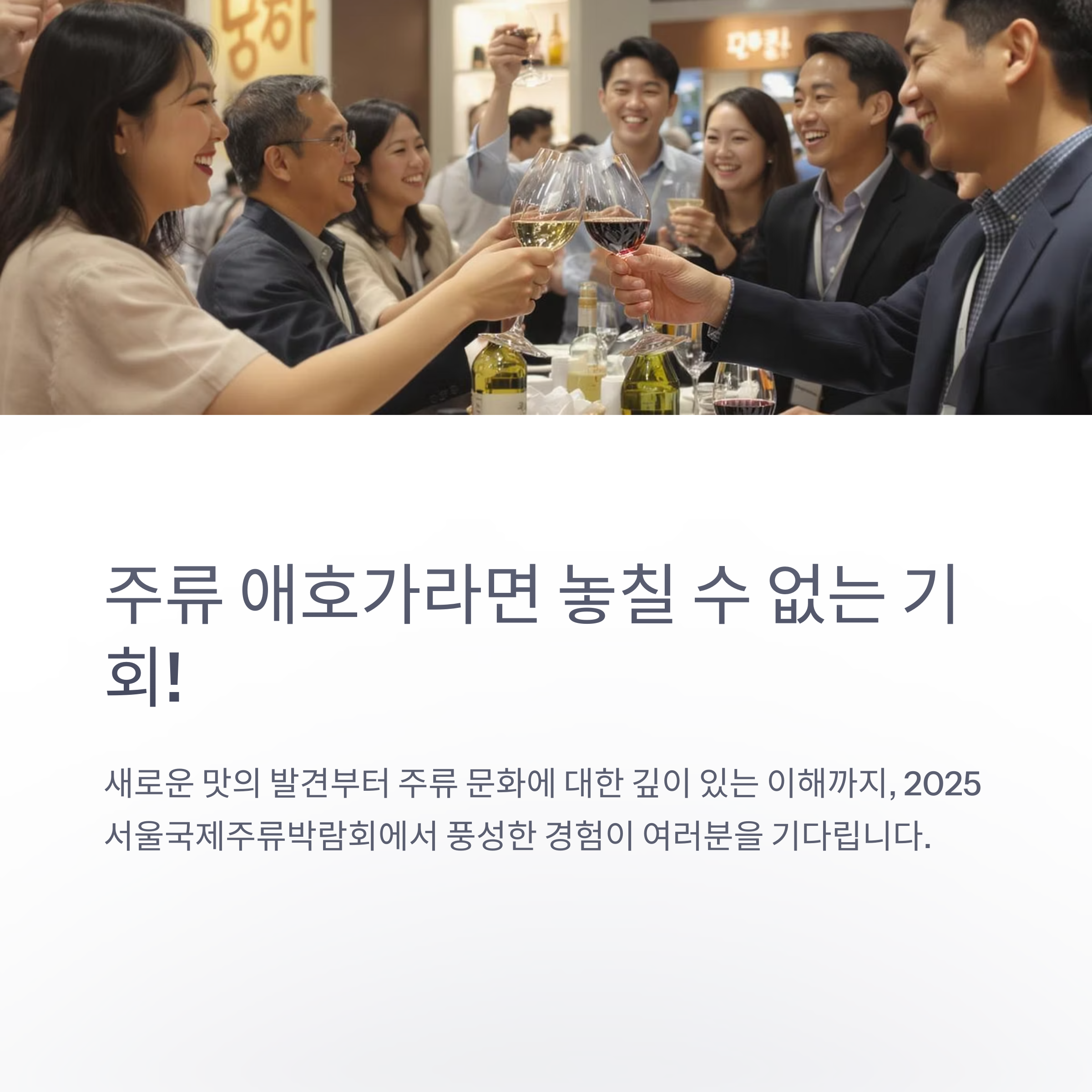 주류를 사랑하는 모든 분들에게 2025년 서울국제주류박람회는 놓칠 수 없는 기회입니다. 새로운 맛의 발견부터 주류 문화에 대한 깊이 있는 이해까지, 풍성한 경험이 기다리고 있습니다. 안전하고 즐거운 관람이 되시길 바랍니다!