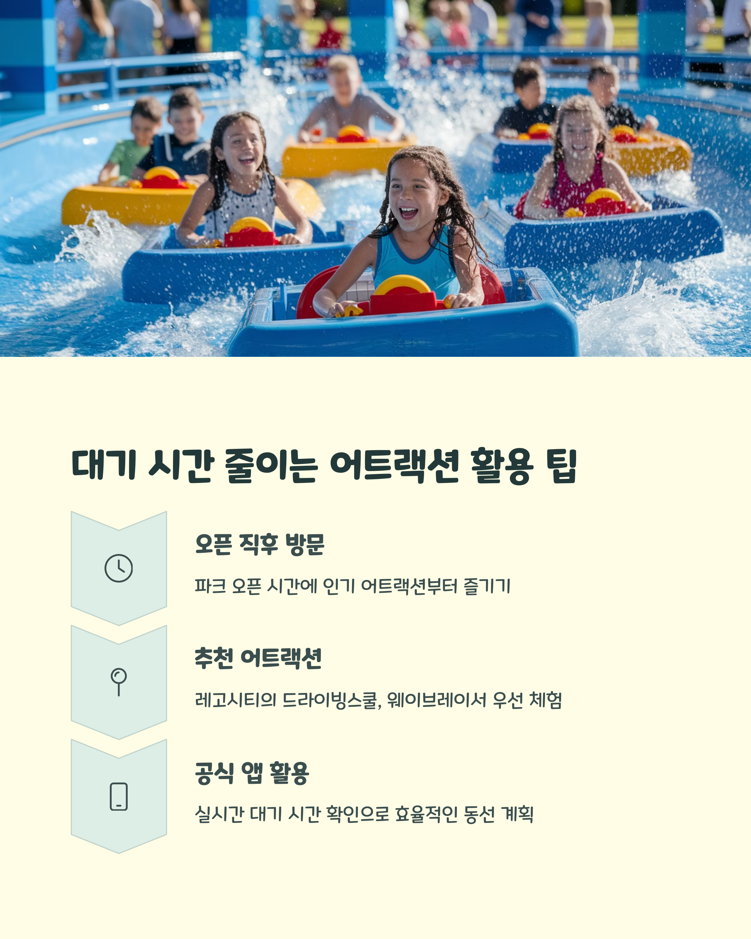 어린이날과 같은 성수기에는 인기 어트랙션의 대기 시간이 길어질 수 있습니다. 효율적인 방문을 위해 다음 팁을 참고하세요: