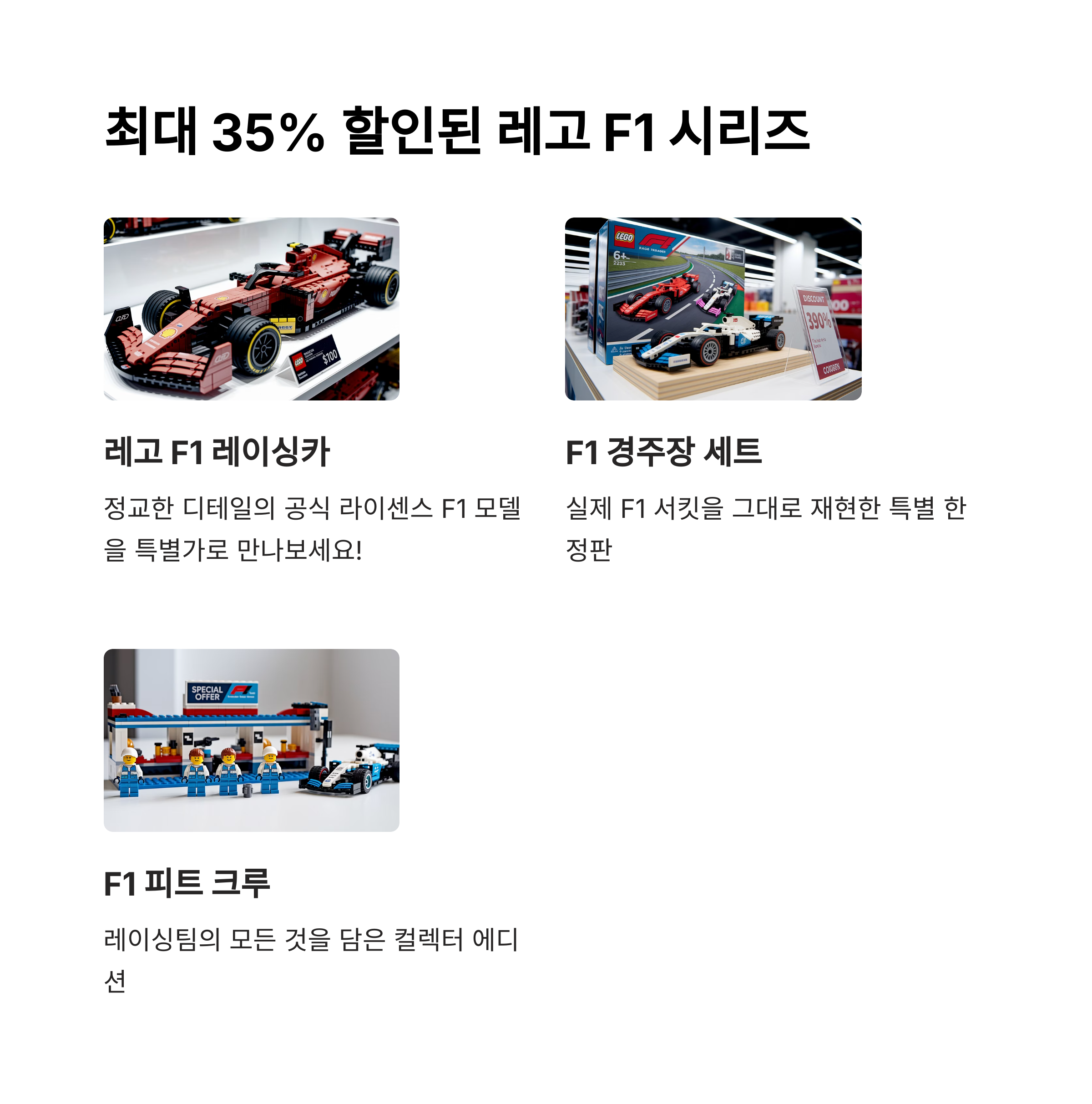 특히 F1 테마의 레고 세트가 다양하게 준비되어 있어, 레이싱 팬들에게 특별한 구매 기회를 제공합니다.