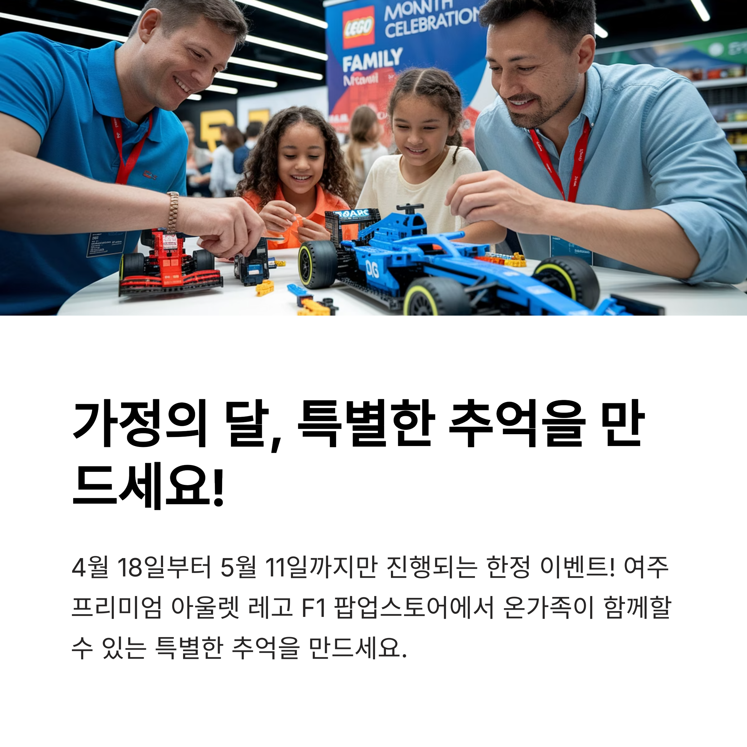 레고코리아가 포뮬러 원(F1) 2025 시즌을 맞아 특별한 팝업스토어를 여주 프리미엄 아울렛에서 운영합니다. 파주 프리미엄 아울렛에서 성공적으로 진행된 팝업스토어가 이제 여주에서 레고와 F1 팬들을 찾아갑니다.