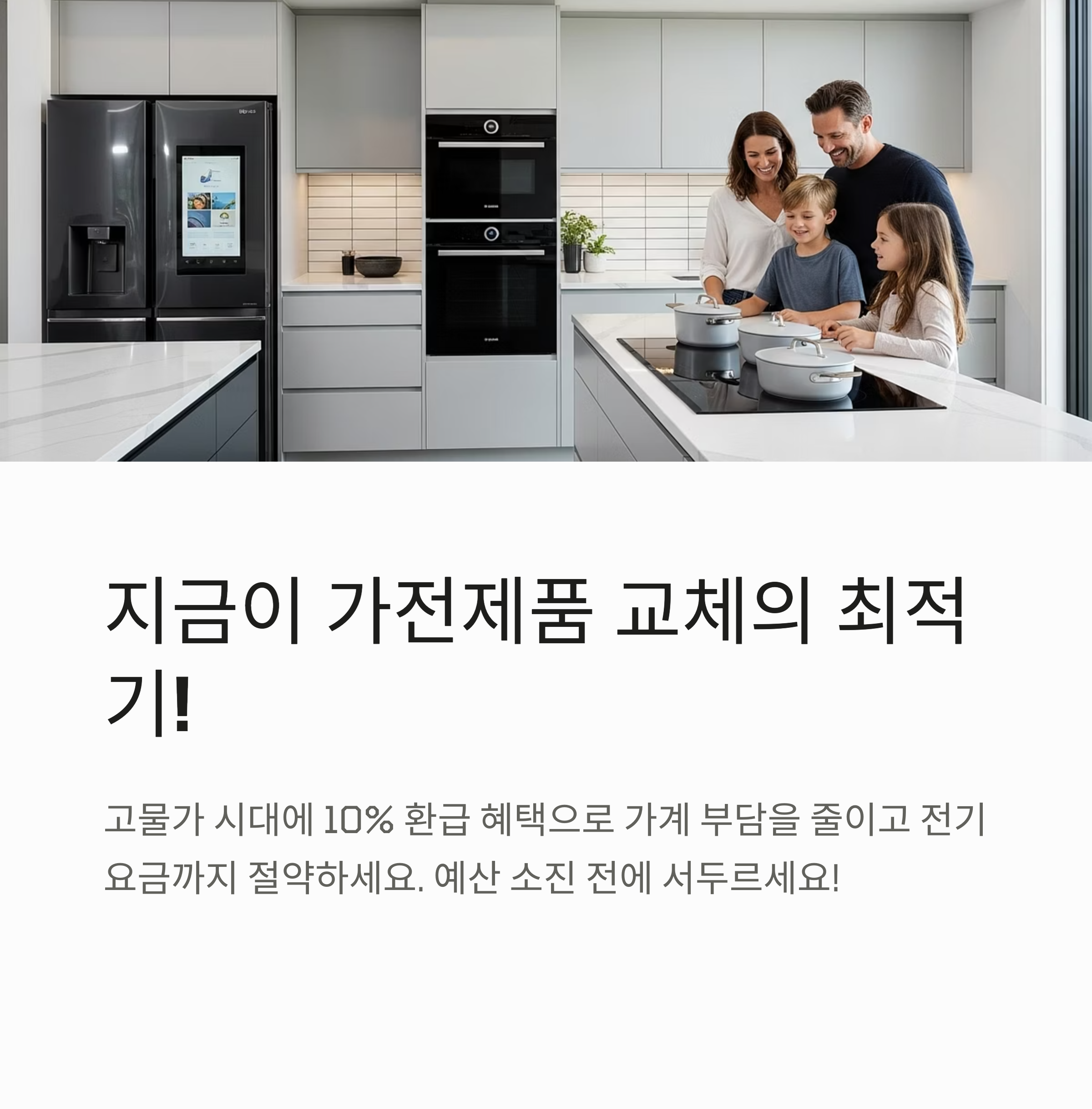 으뜸효율 가전 환급 사업은 고물가 시대에 가계 부담을 덜어주고, 장기적으로는 전기요금 절약에도 기여하는 일석이조의 정책입니다. 낡은 가전 교체를 망설이고 있었다면, 10% 환급 혜택을 받을 수 있는 지금이 가장 좋은 기회입니다. 이 글을 참고하여 필요 서류를 꼼꼼히 챙기시고, 신청이 시작되는 즉시 접수하여 '선착순 마감' 전에 꼭 환급 혜택을 받으시길 바랍니다. 스마트한 소비로 시원하고 알뜰한 2025년을 보내세요!