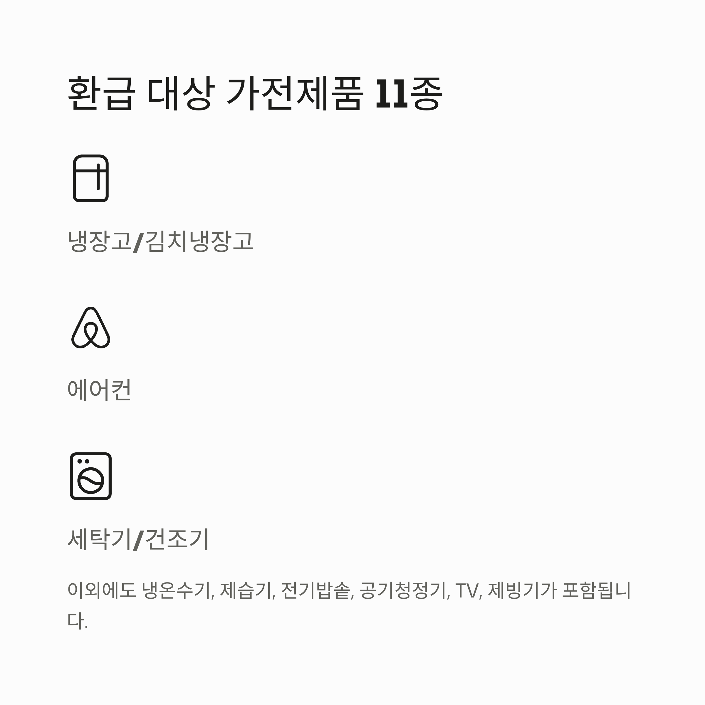 - 환급 대상 품목 (11종): 냉장고, 김치냉장고, 에어컨(벽걸이/스탠드/시스템), 세탁기, 의류건조기, 냉온수기, 제습기, 전기밥솥, 공기청정기, TV, 제빙기