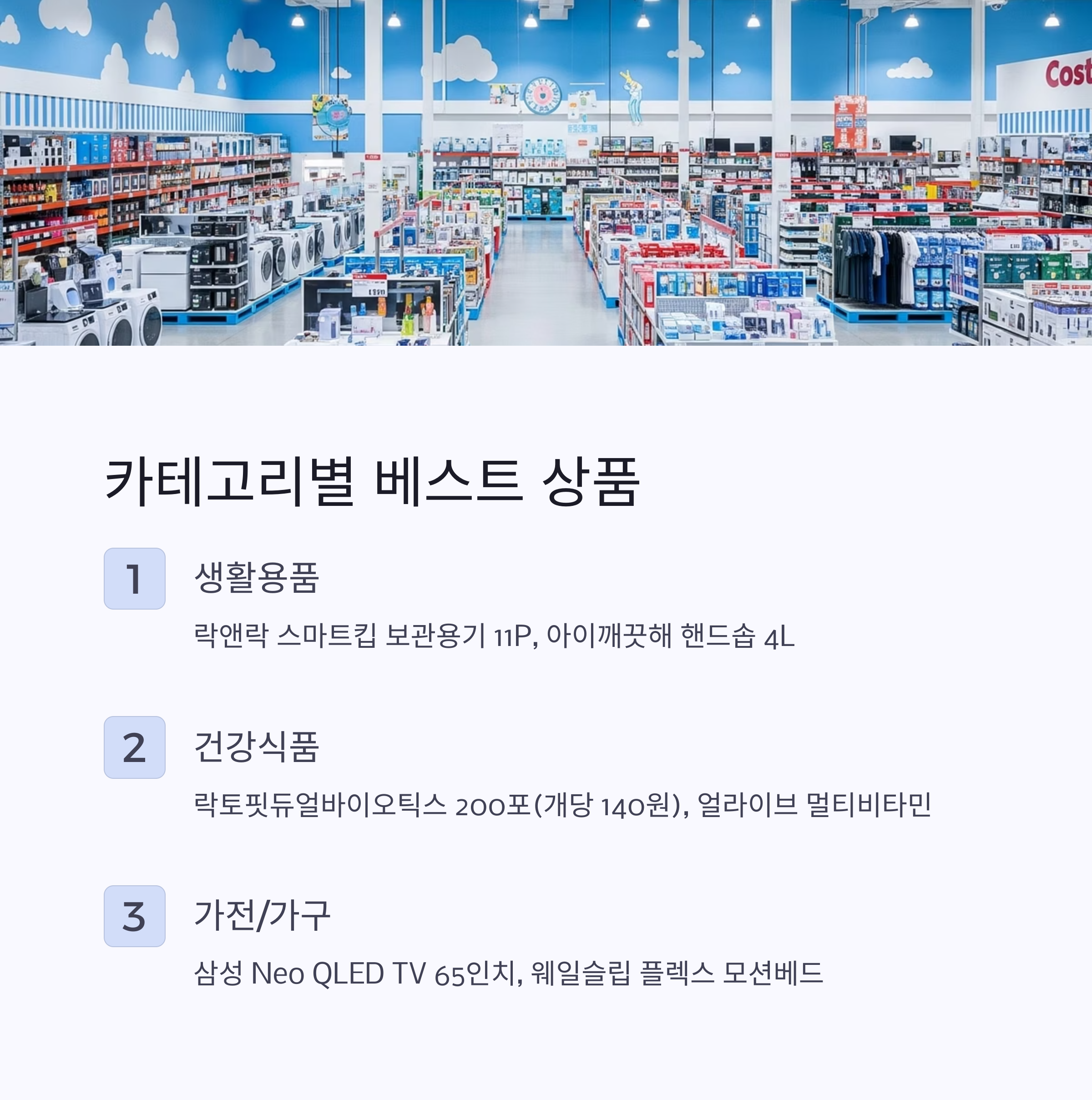 이번 주 코스트코에서 놓치면 안 될 베스트 상품들을 카테고리별로 엄선했습니다. 실용성과 경제성을 모두 고려한 추천 상품들로 알찬 쇼핑을 완성해보세요.