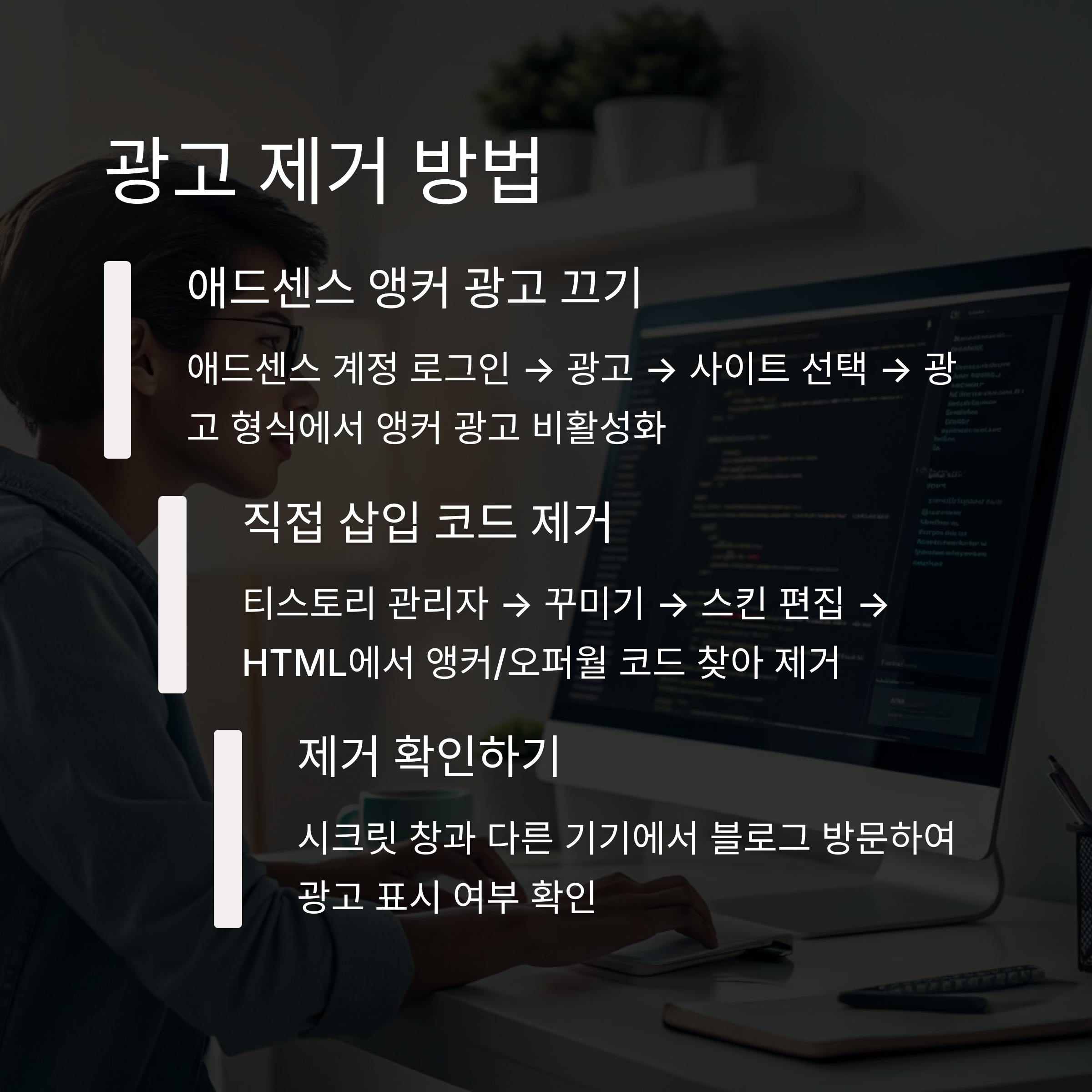 - 블로그에 직접 오퍼월 광고 코드를 삽입한 경우, 해당 코드를 티스토리 스킨 편집기나 글 내용에서 찾아 제거합니다.
