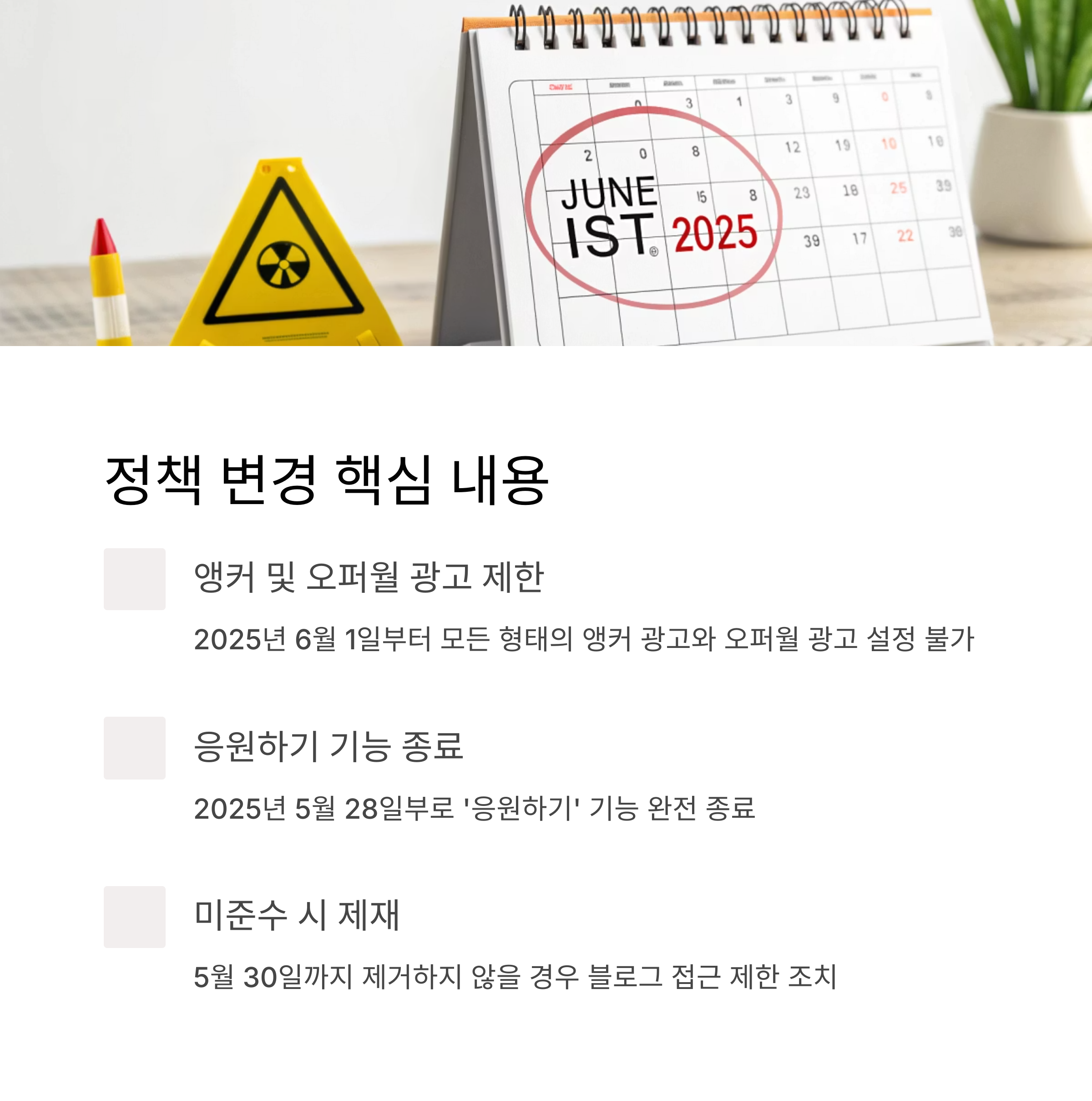 2025년 6월 1일부터 시행되는 이 정책에 대비하여 블로거들은 5월 30일까지 해당 광고 유형을 제거해야 하며, 시행일 이후에도 계속 사용할 경우 블로그 접근이 제한되는 규제 조치가 적용됩니다.
