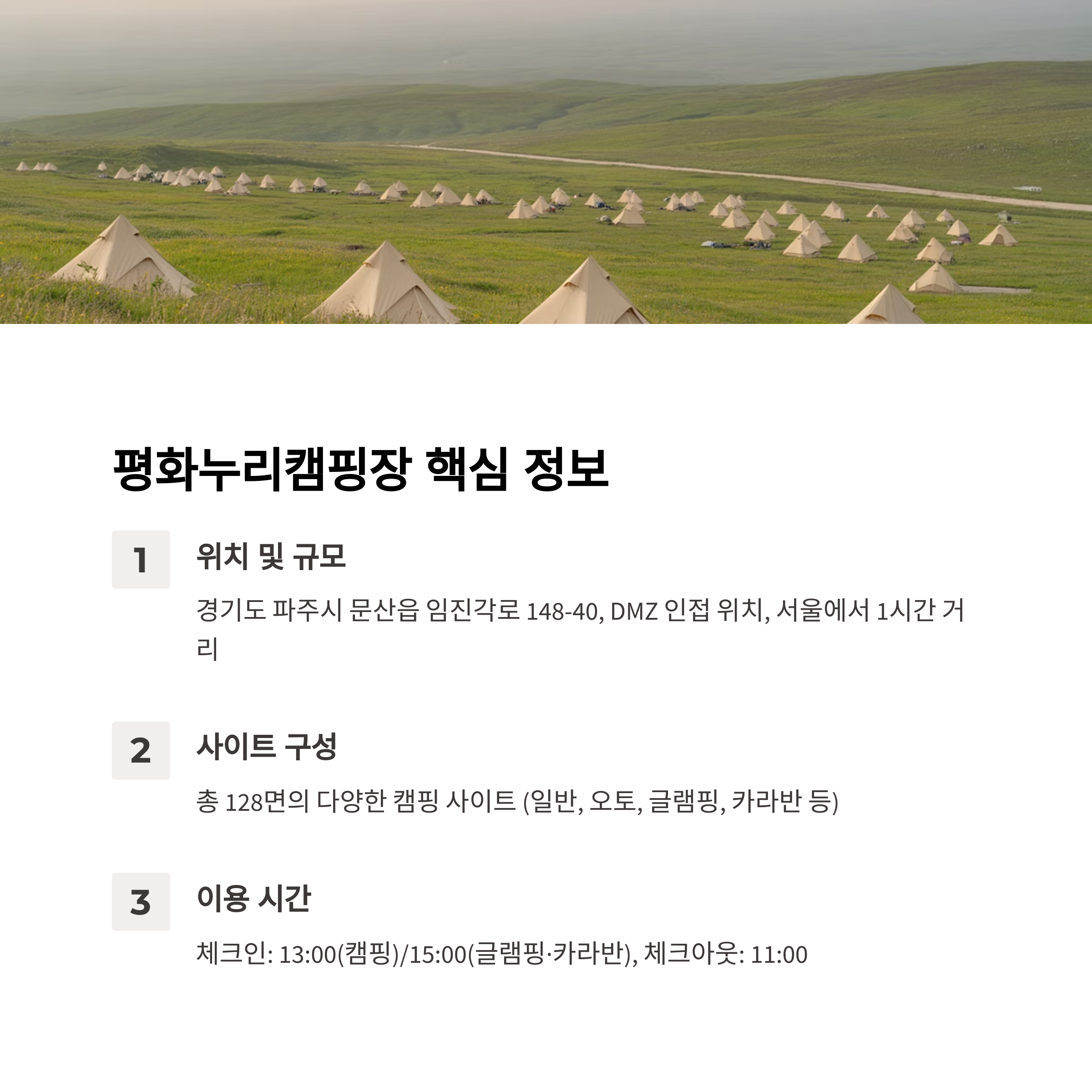 서울에서 자차로 약 1시간 거리에 위치해 접근성이 뛰어나며, 평화의 상징인 임진각과 함께 특별한 캠핑 경험을 선사합니다. 무엇보다 공공캠핑장 특유의 합리적인 가격과 체계적인 관리 시스템으로 초보 캠퍼들에게도 강력 추천하는 캠핑장입니다.