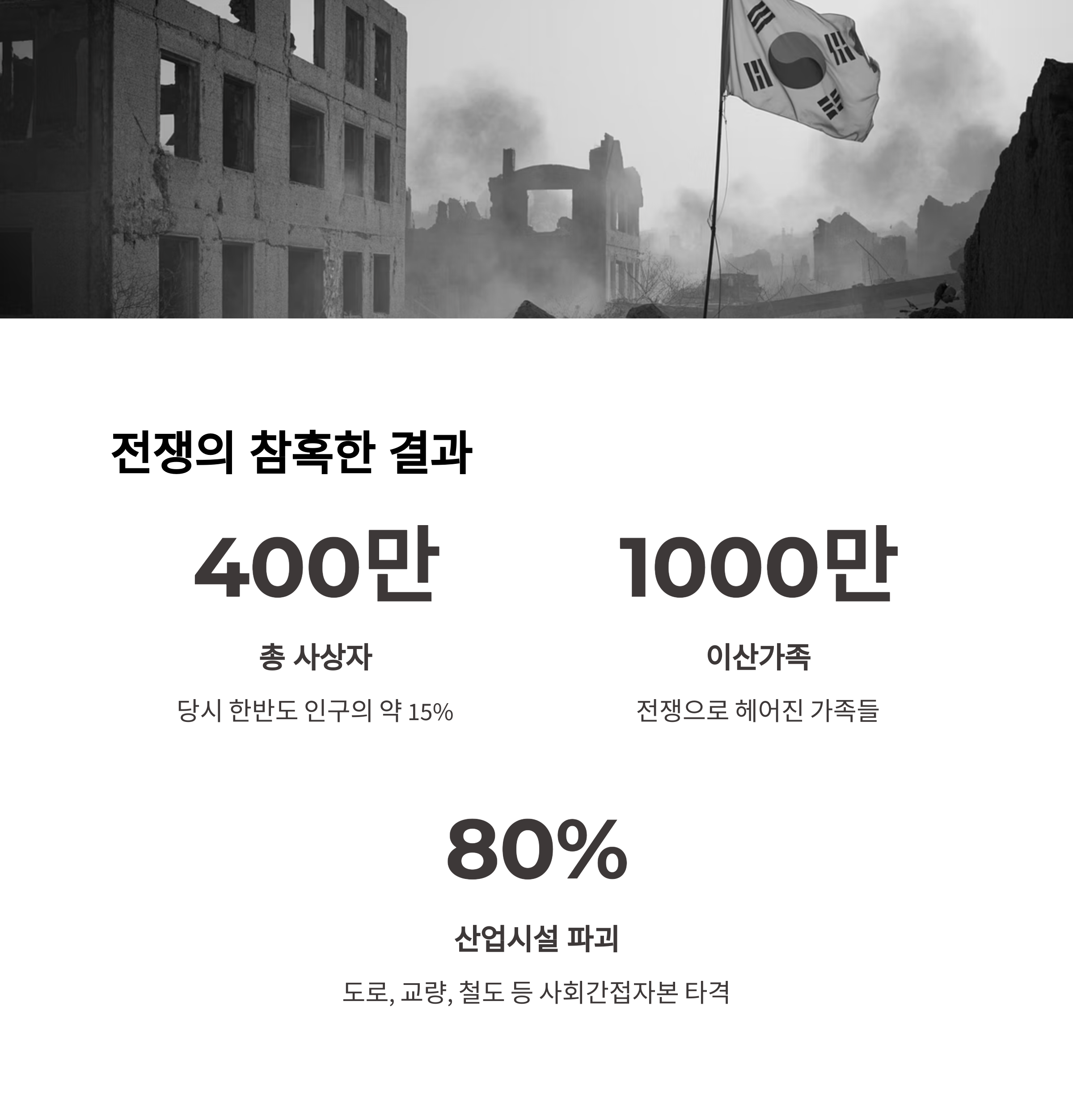 • 전쟁 기간: 1950년 6월 25일 ~ 1953년 7월 27일 (3년 1개월 2일)