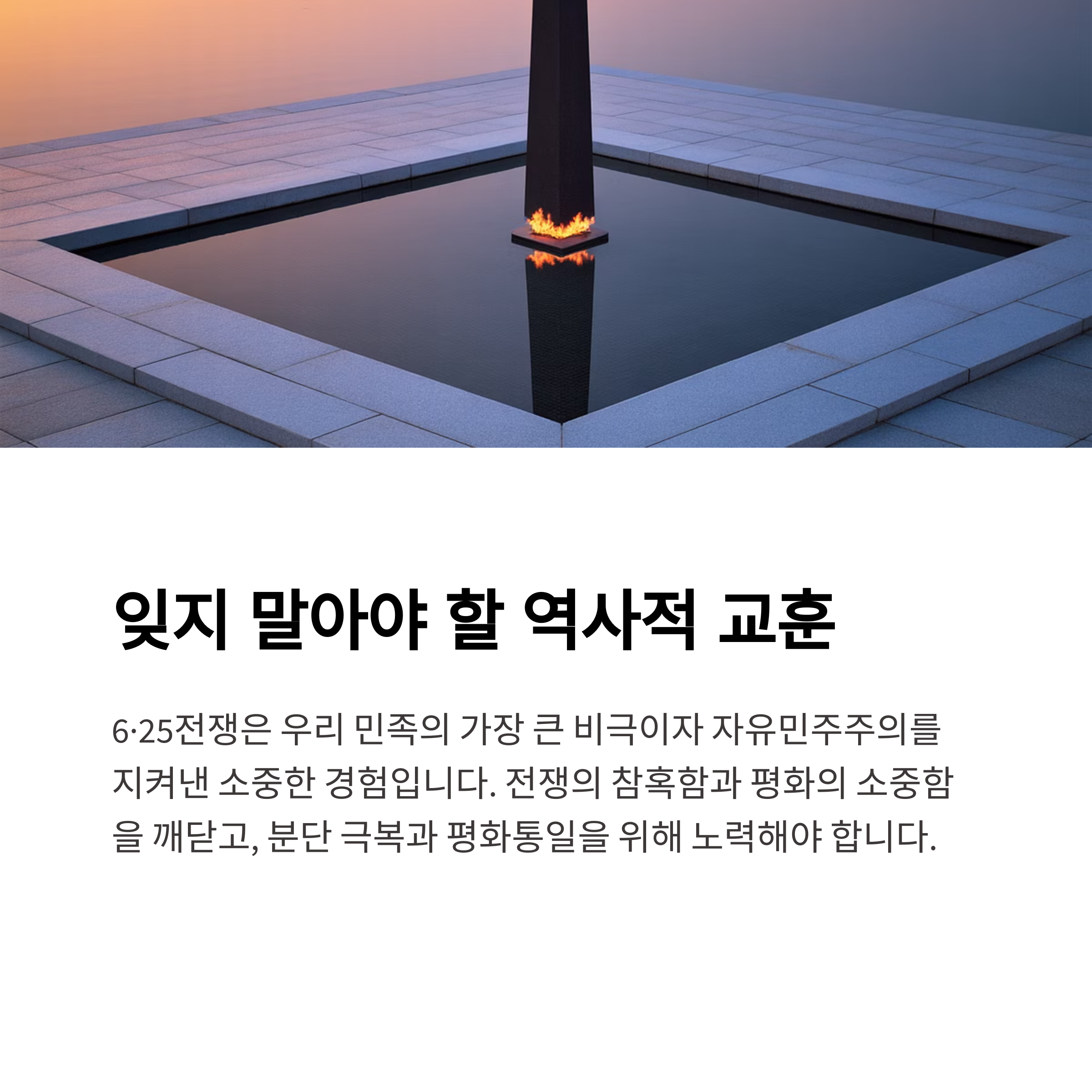 6·25전쟁은 우리 민족의 가장 큰 비극이었지만, 동시에 자유민주주의를 지켜낸 소중한 경험이기도 합니다. 전쟁으로 희생된 모든 분들을 기억하고, 그들의 숭고한 희생 위에 오늘의 대한민국이 있음을 잊지 말아야 합니다.