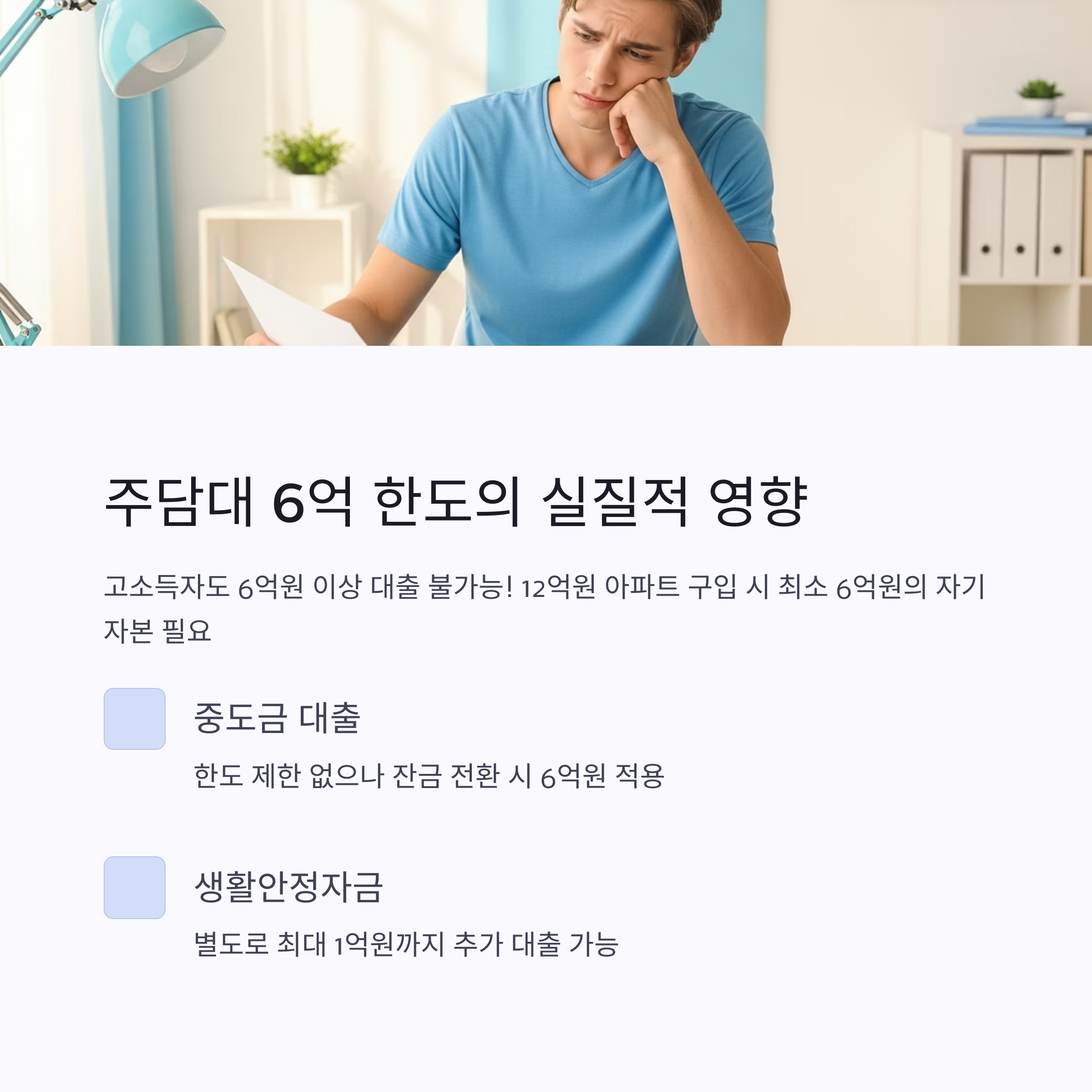 - 절대적 한도 제한: 연소득 10억원이라도 6억원 이상 대출 불가