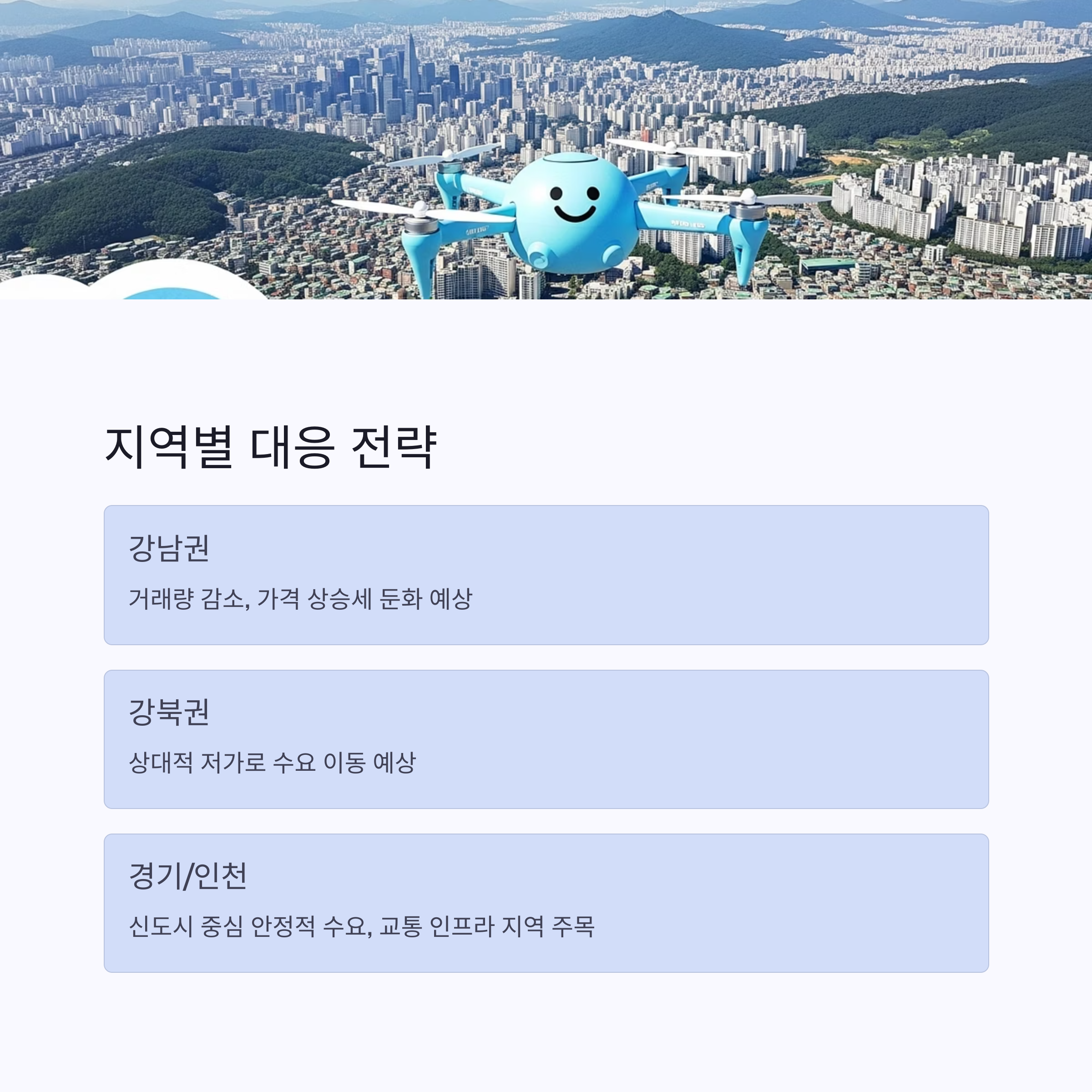 강남권 대응 전략: 강남구, 서초구, 송파구 등 강남권은 평균 거래가격이 20억원을 넘는 지역이 많아 이번 대책의 직접적인 타격을 받고 있습니다. 이 지역에서는 당분간 거래량 감소와 가격 상승세 둔화가 예상되므로, 장기적 관점에서 접근하는 것이 바람직합니다.