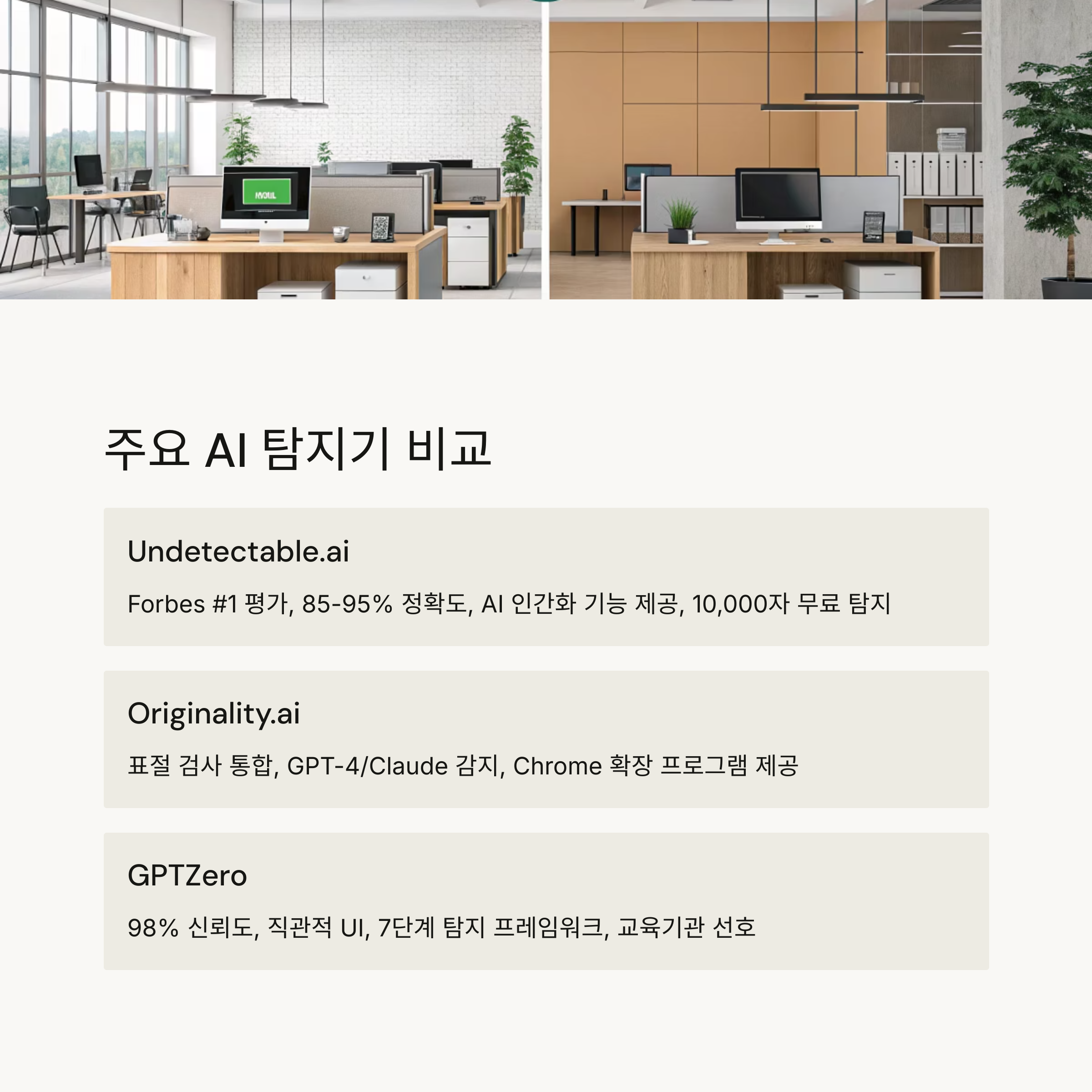다양한 AI 탐지 도구들이 등장하면서 각각의 특징과 성능에 차이가 있습니다. 아래는 2025년 기준 가장 주목받는 AI 검사기들의 비교입니다.
