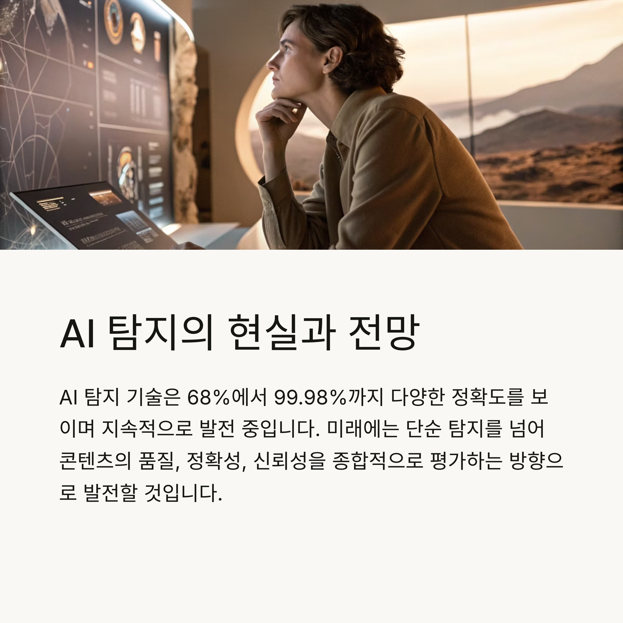 미래에는 AI 탐지 기술이 단순한 '탐지'를 넘어 콘텐츠의 품질, 정확성, 신뢰성을 종합적으로 평가하는 방향으로 발전할 것으로 예상됩니다. 이를 통해 AI와 인간의 협업으로 만들어진 고품질 콘텐츠는 인정받고, 저품질 콘텐츠는 걸러내는 보다 발전된 시스템이 구축될 것입니다.