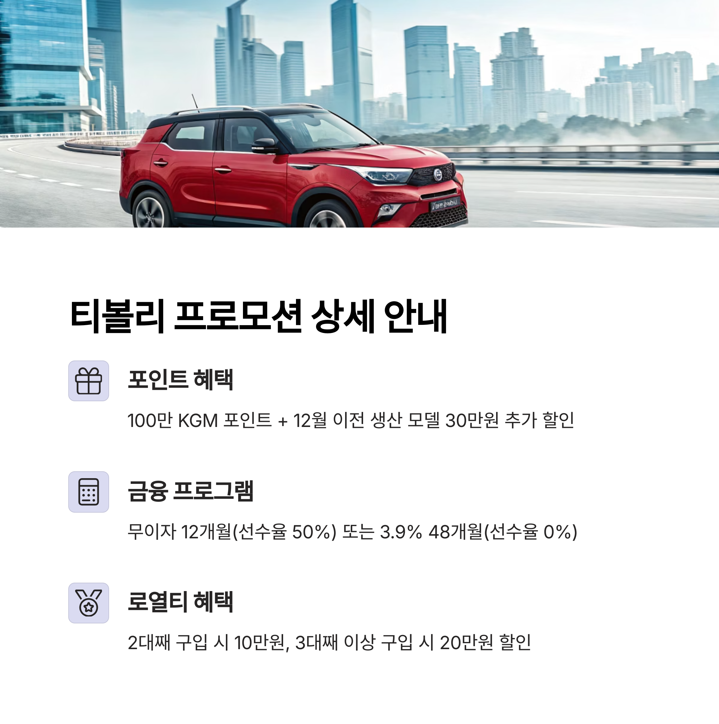 KGM은 기본 프로모션 외에도 차종별로 다양한 추가 혜택을 제공합니다. 각 차종별 특별 할인 및 생산월별 할인, 로열티 혜택, 중고차 트레이드인 등 다양한 추가 혜택을 확인해 보세요.