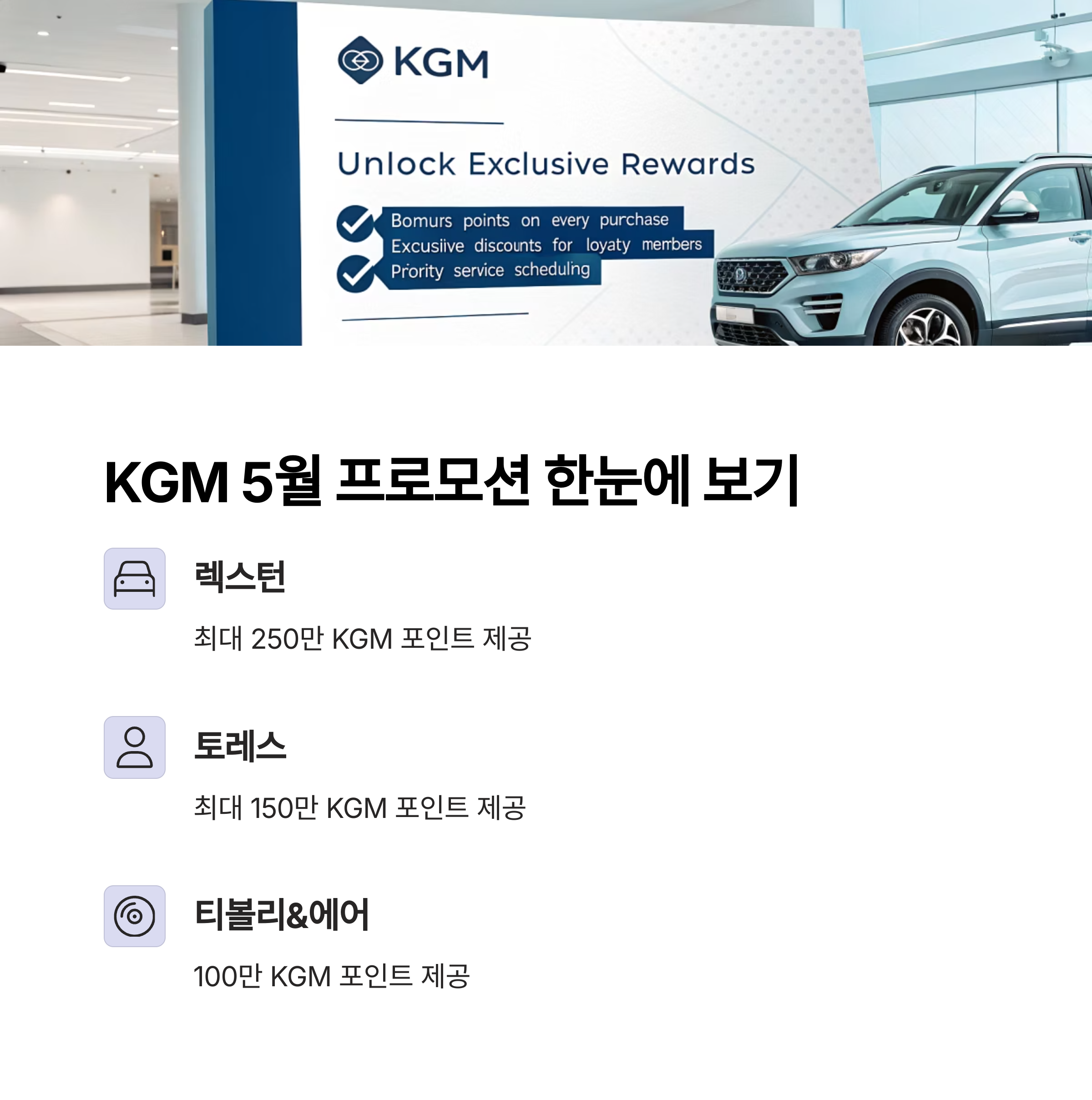 KGM의 5월 프로모션은 토레스, 티볼리, 렉스턴 등 인기 차종에 대해 최대 250만 KGM 포인트를 비롯한 다양한 혜택을 제공합니다. 차종별로 생산월 할인, 중고차 트레이드인, 로열티 프로그램 등 추가 혜택도 함께 제공되어 최대한의 할인 혜택을 누릴 수 있습니다.