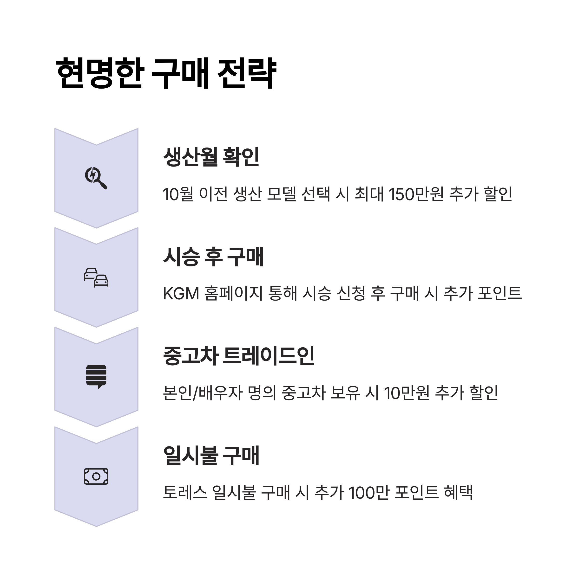 KGM의 5월 프로모션을 최대한 활용하기 위한 현명한 구매 전략을 알아보겠습니다. 차종별 특성과 구매 방법에 따라 혜택을 극대화하는 방법을 소개합니다.