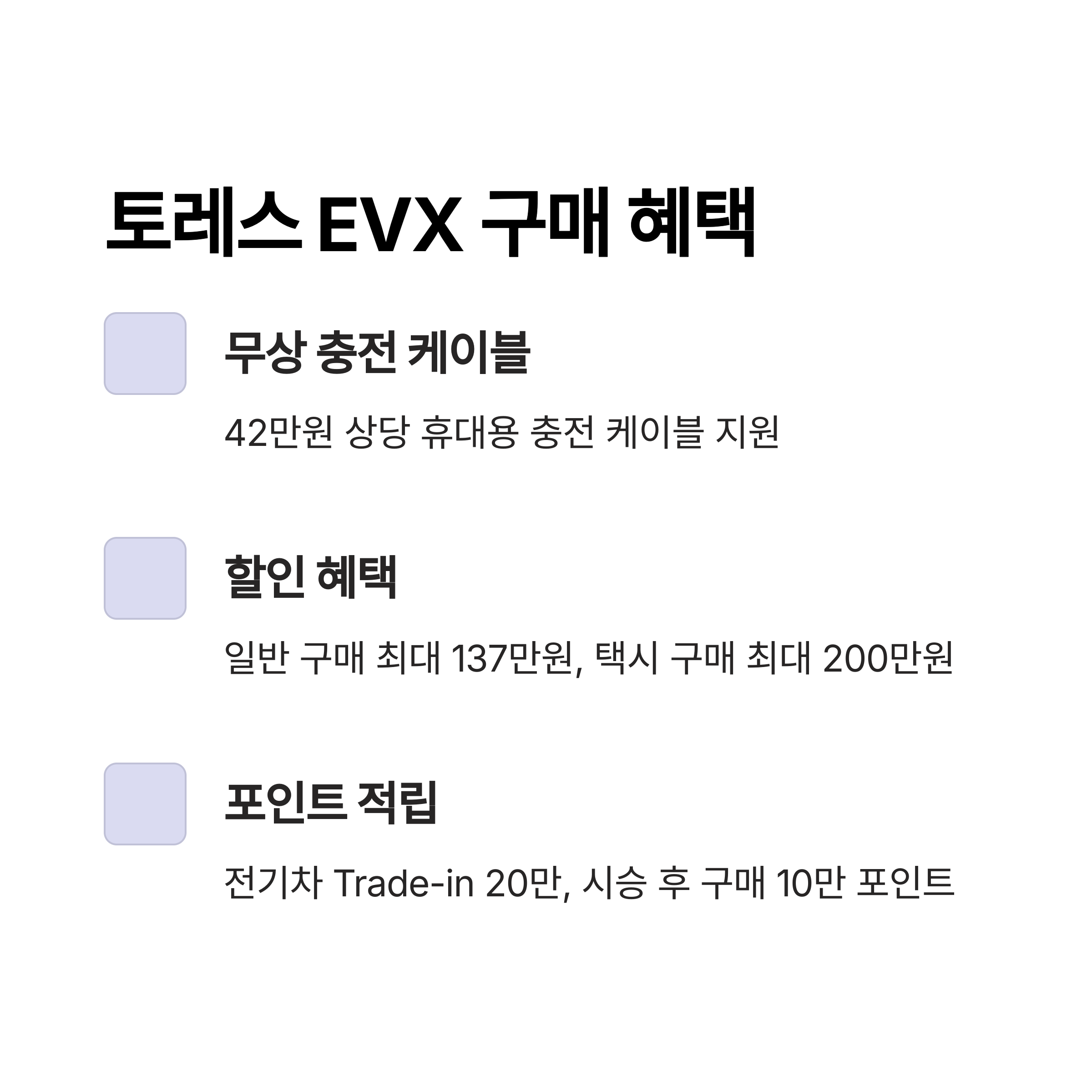 KGM은 5월 판촉 프로모션의 일환으로 토레스 EVX 구매 시 42만원 상당의 휴대용 충전 케이블을 무상으로 지원합니다. 일반 구매 고객에게는 77만원(18인치 휠 모델)부터 137만원(20인치 휠 모델)까지의 할인 혜택이 제공되며, 택시 구매 고객에게는 최대 200만원(기본+일시불 혜택)의 특별 할인이 적용됩니다.