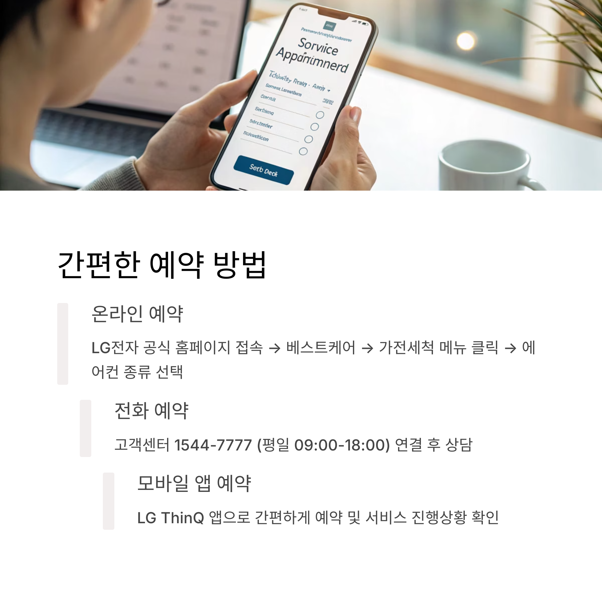 LG에어컨 청소 서비스 예약은 온라인과 전화 두 가지 방법으로 가능합니다. 각각의 장단점을 파악하고 본인에게 맞는 방법을 선택하시면 됩니다.