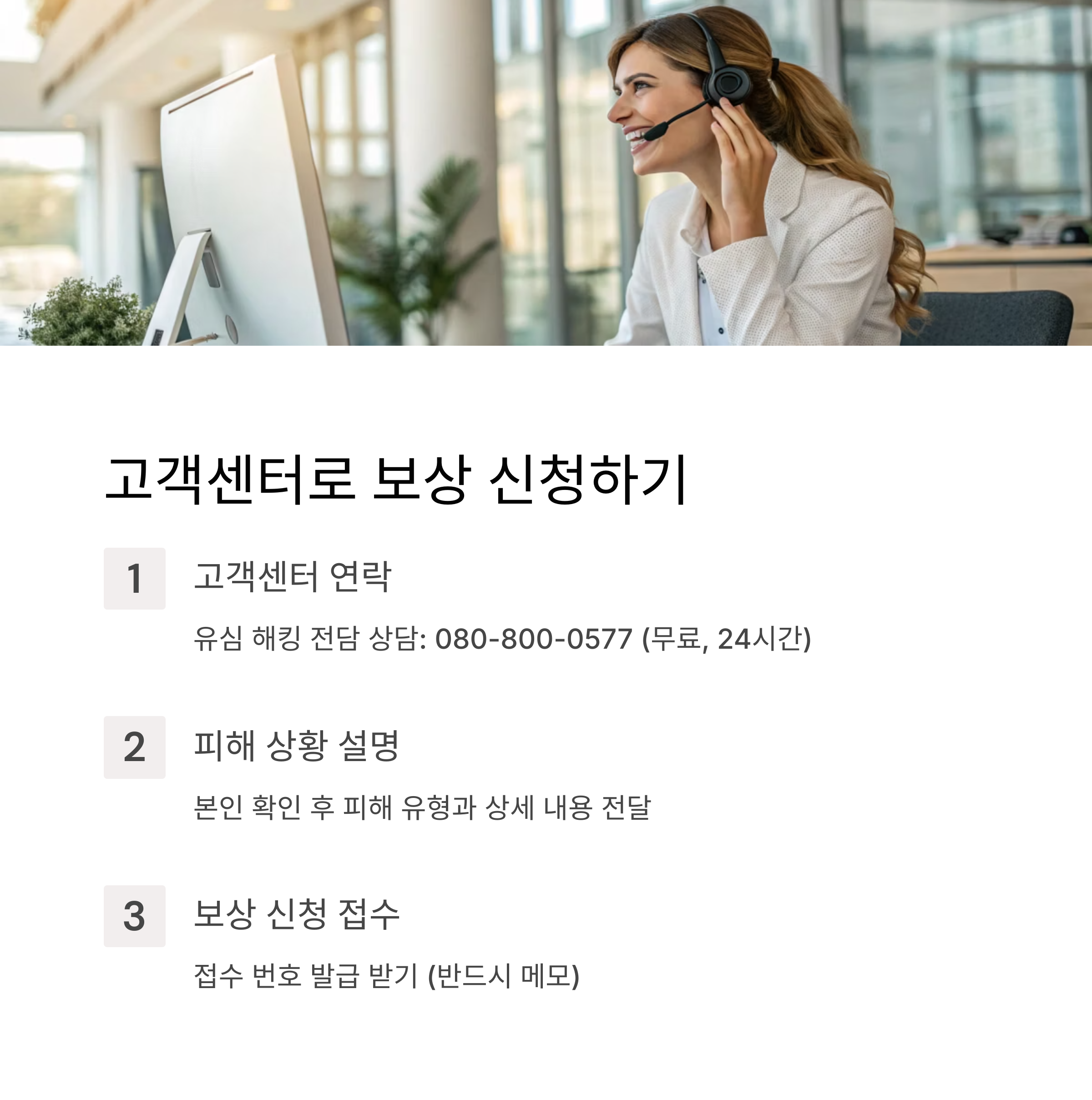⚠️ 주의: 동일한 피해에 대해 여러 채널로 중복 신청하면 처리가 지연될 수 있습니다. 한 채널을 통해 신청하고 접수번호를 반드시 기록해 두세요.
