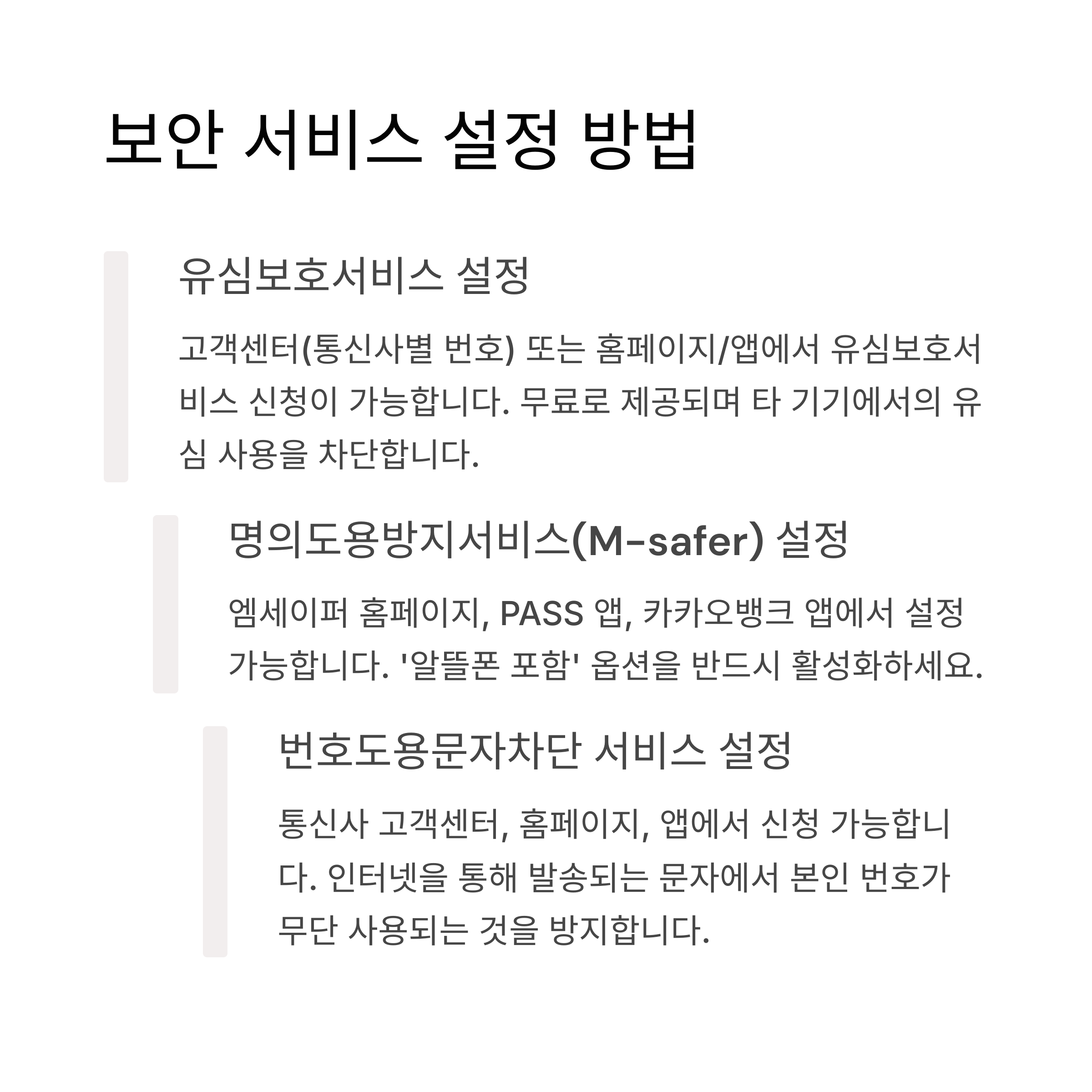 이러한 보안 서비스들은 모두 무료로 제공되며, KT망 알뜰폰으로 이동한 후에도 반드시 설정해 두는 것이 중요합니다. 통신사가 바뀌더라도 보안 위협은 언제든 존재할 수 있으므로, 선제적인 보안 조치가 필요합니다.